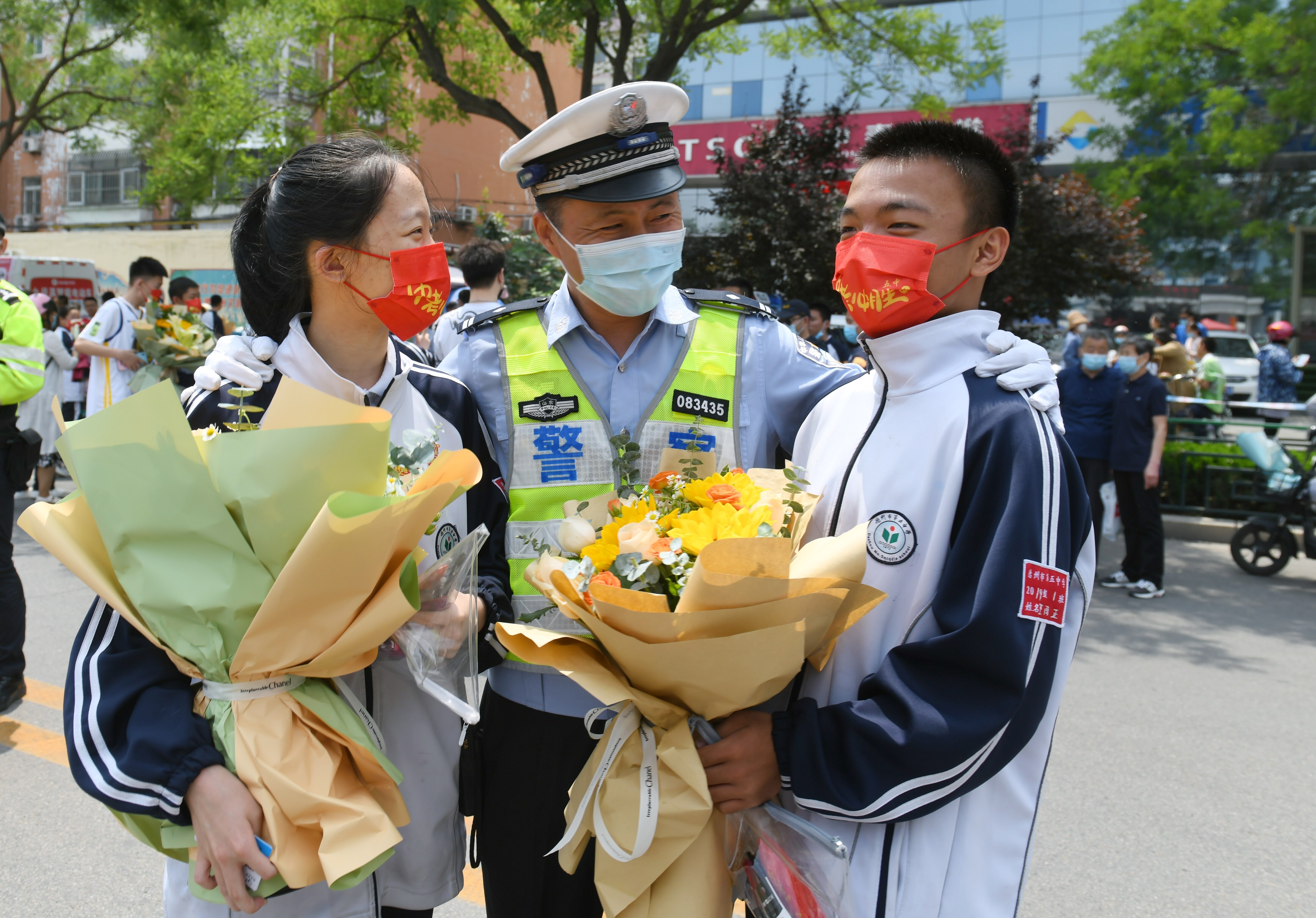 考场外护考的德州市公安局交警支队直属一大队副大队长王震非常激动,他的龙凤胎孩子也顺利完成考试,看到两个孩子走出考场,王震将鲜花送到了他们手里。