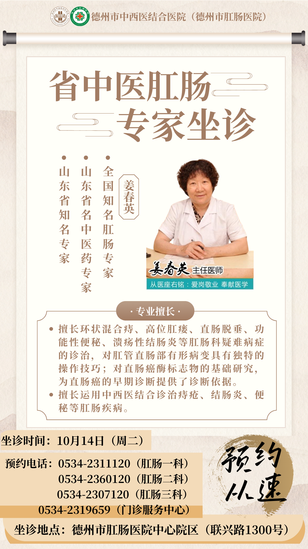 姜春英,主任医师,教授,博士研究生导师。全国知名肛肠病专家,国家第五批名老中医药传承指导老师,山东省名中医药专家,山东省知名专家。从事肛肠专业30余年,逐渐形成独具特色的中医、中西医诊治肛肠疾病的学术思想,特别是对环状混合痔、高位肛瘘、直肠脱垂、功能性便秘、溃疡性结肠炎等肛肠科疑难病症的诊治,积累了丰富的临床经验;对肛管直肠部有形病变具有独特的操作技巧;对多种术式进行了改良并有所突破,如环状混合痔的“肛垫保留分瓣断桥缝合术”,高位肛瘘的“内口切除顶端清创对口引流术”,目前已被省内外同行广泛采用。研制的“复方荆芥熏洗剂”成为省中医治疗肛肠疾病的首选洗剂,近年研制的“三木颗粒洗剂”系列药物,“灵菇合剂”治疗便秘,受到患者的广泛好评。对直肠癌酶标志物的基础研究,为直肠癌的早期诊断提供了诊断依据。