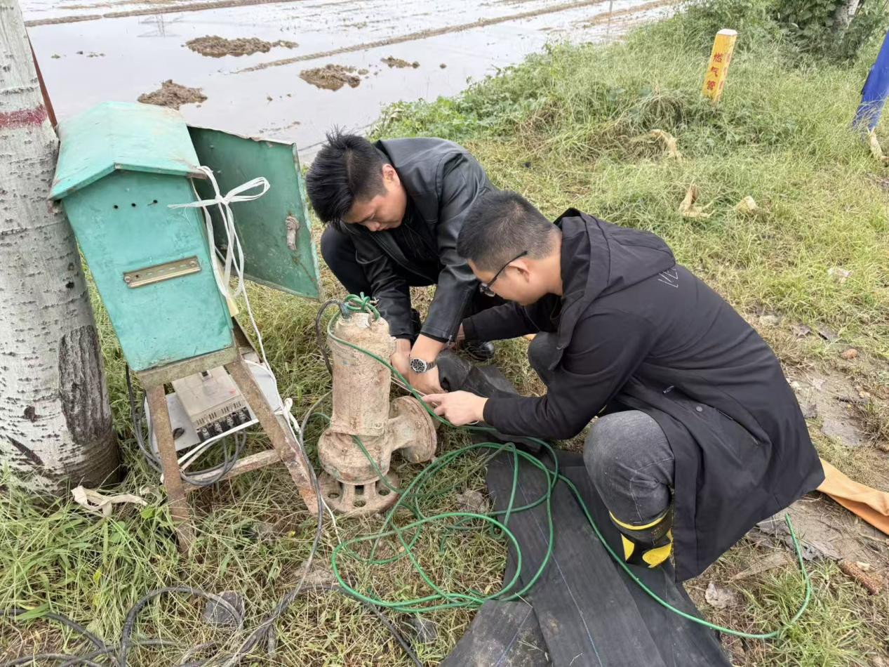 在于集乡张西楼村东侧的玉米地里,青年干部刘祥携带专业工具,发挥自己的优势特长,正在仔细检查电路接口,帮助村民调试抽水泵,对受损的线路接口进行绝缘包扎、更换零件,快速恢复了供电安全,确保了排水作业不间断、不延误。