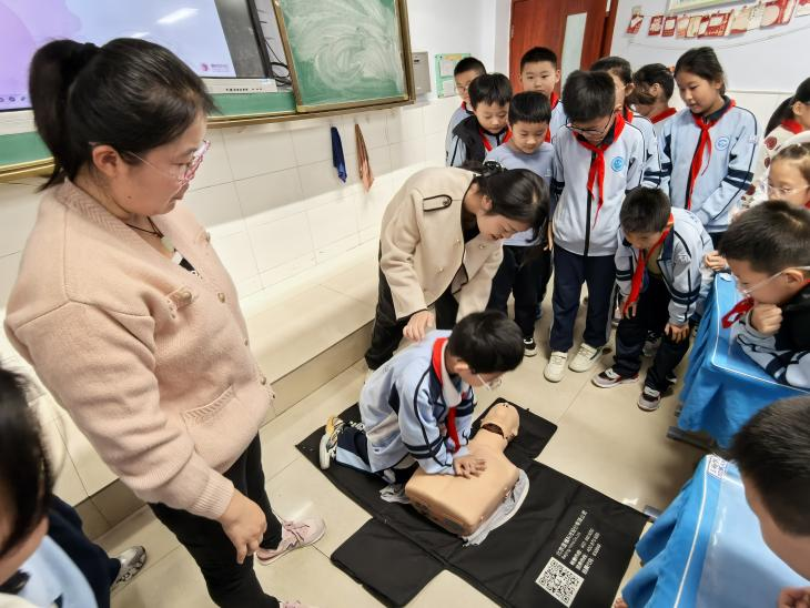 身为儿科医生的家长讲师闫文惠,利用医用绷带和模型,现场演示了遇到磕伤、烫伤、流鼻血等意外时的正确处理方法。学生们纷纷动手模仿,学习如何为自己和他人进行简单的急救。“今天我学会了怎么包扎,以后如果同学不小心受伤,我也能帮忙了!”学生王孝先骄傲地展示着自己的练习成果。