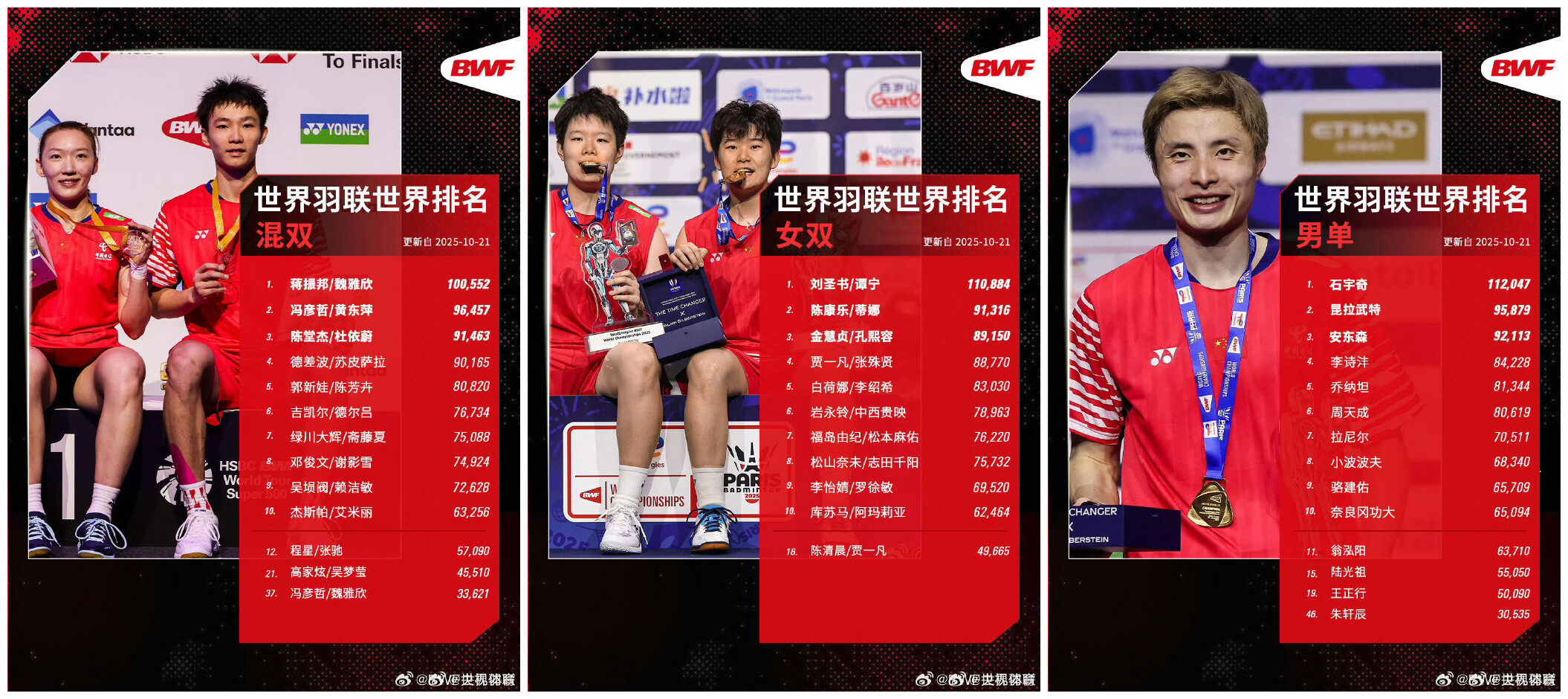 世界羽联2025年第43周世界排名揭晓,中国队强势包揽三项世界第一:石宇奇(男单)、刘圣书/谭宁(女双)、蒋振邦/魏雅欣(混双)均以10万+高分继续领跑各单项第一。据央视体育
