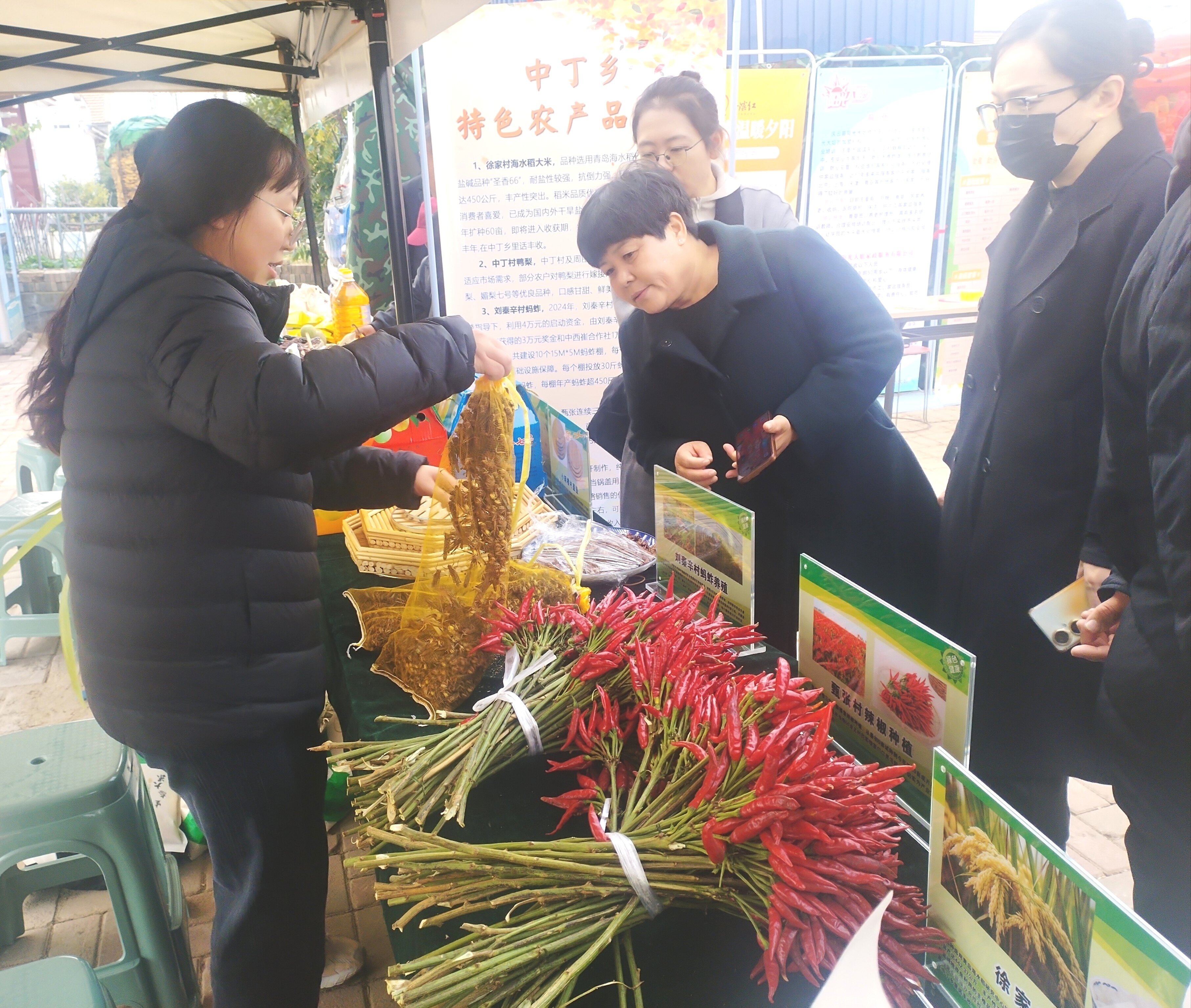 展销会上,中丁乡展区产品丰富、各具特色。徐家村海水稻大米作为盐碱地综合利用的典范,以其优良品质赢得消费者连连称赞;中丁村鸭梨通过品种改良,推出富硒梨、秋月梨等多个品种,以甘甜多汁的口感传递“关爱健康”的天然理念;刘秦辛村蚂蚱养殖项目以创新模式和可观效益吸引众多关注,生动诠释“小资金撬动大产业”的创业故事;甄张村辣椒实现从试种到规模化种植的跨越,有效带动60余名村民就业,成为助农增收的“幸福椒”;小胡楼村手工盖垫则依托电商平台畅销全国,展现传统手工艺与现代销售模式的完美融合,每年带动百余村民实现家门口增收。