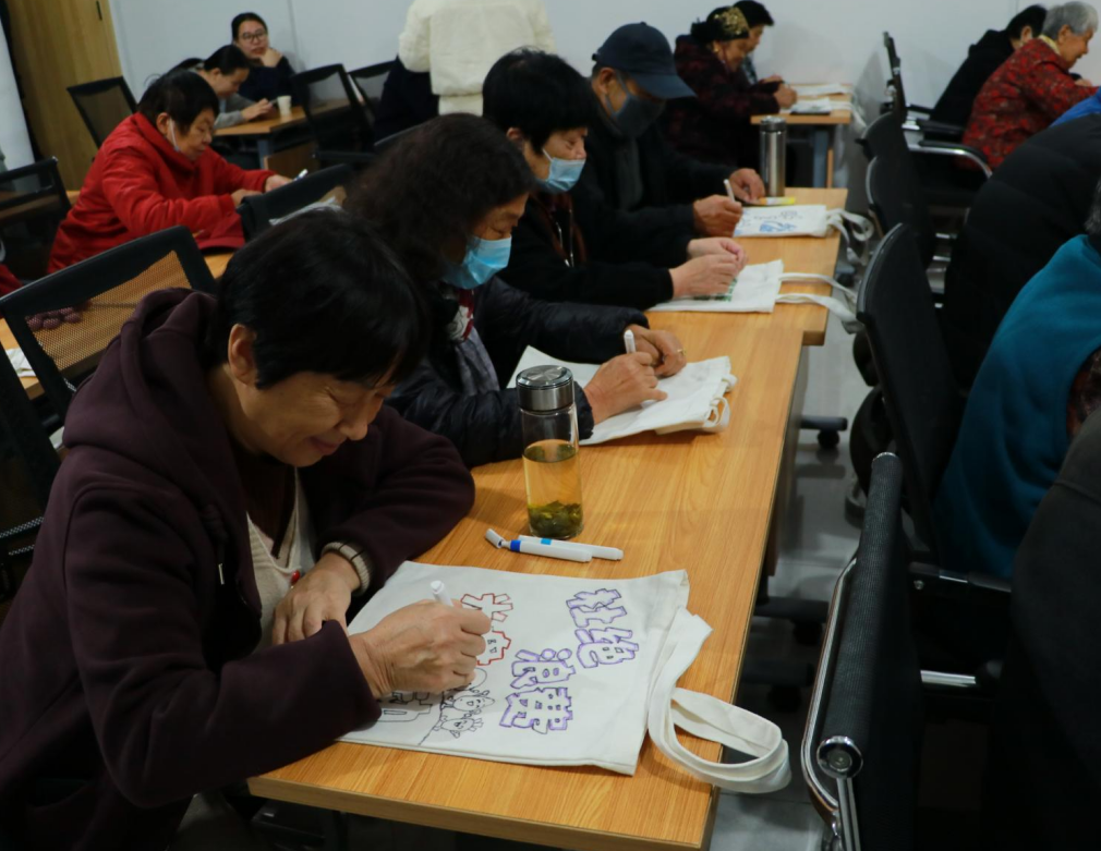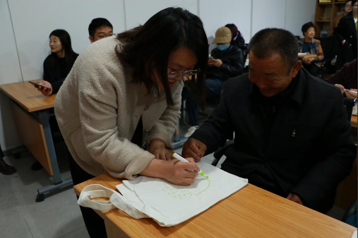 手工创作环节则理念融入实践,工作人员为每位参与者发放空白布包、马克笔等材料,并提供节俭主题标语参考。参与者发挥创意设计专属标语,在工作人员现场指导下完成布包制作,随后依次展示作品,分享标语含义与创作思路,让节俭理念通过实践深入人心。