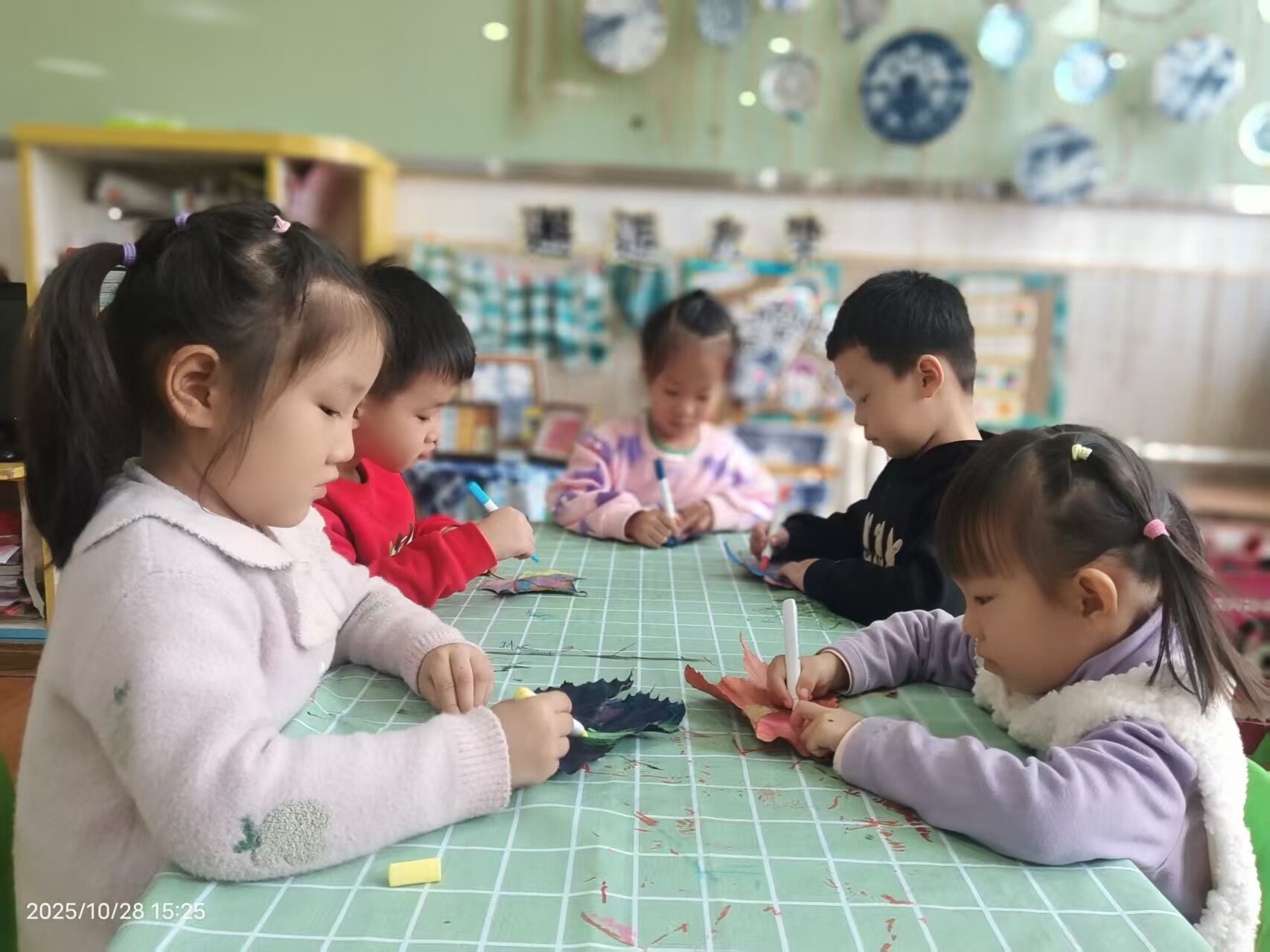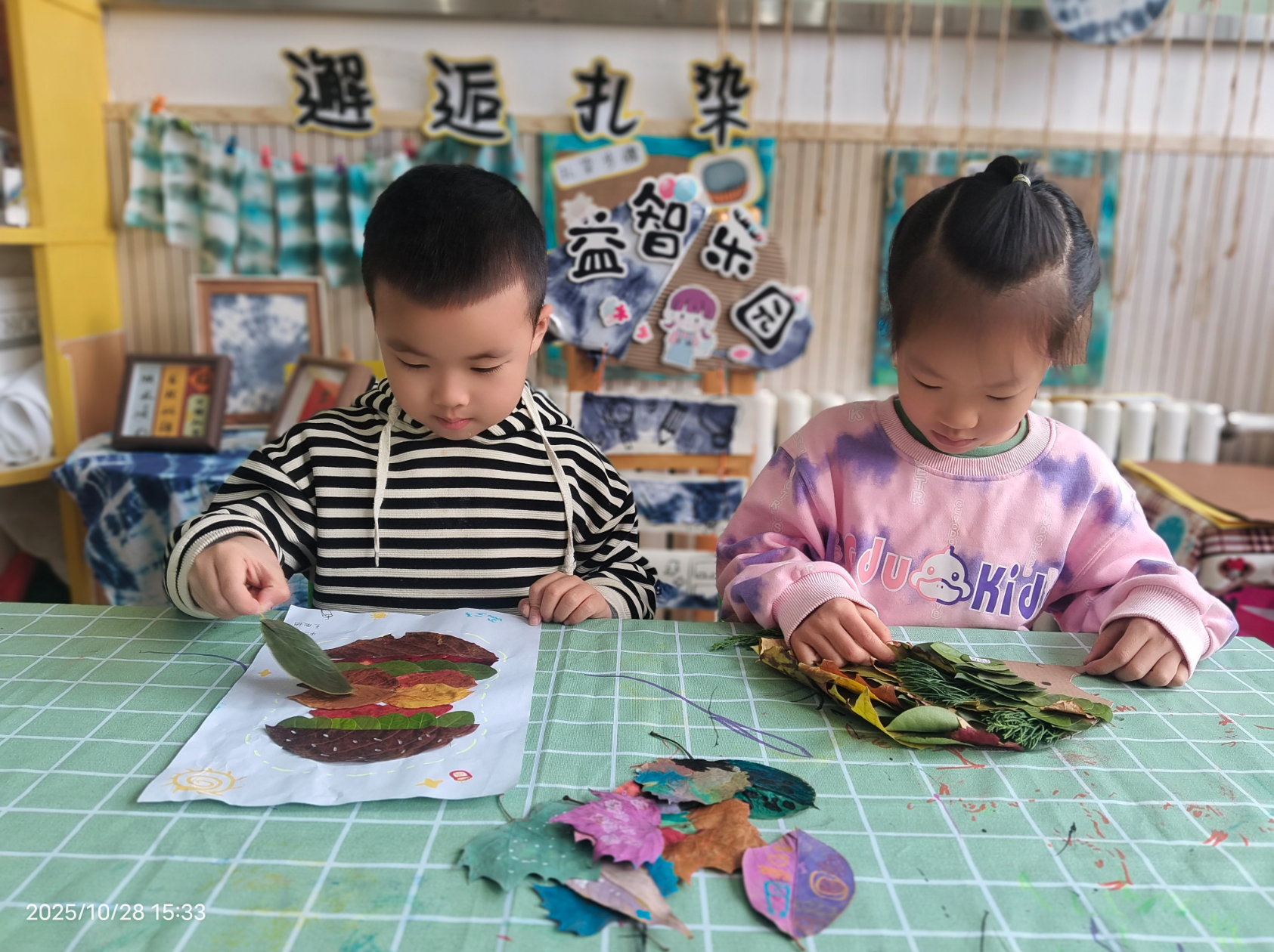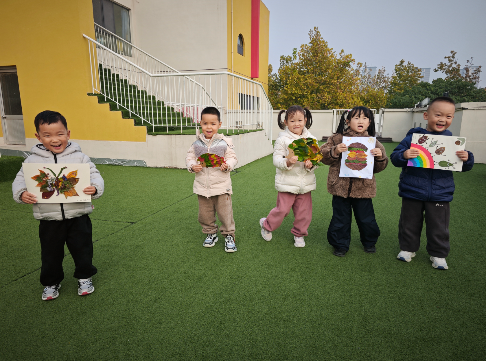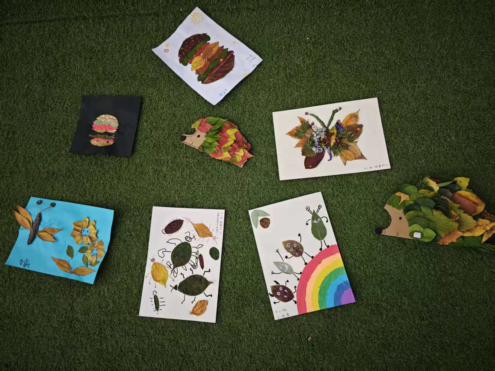 在创作过程中,孩子们分工合作、相互启发。他们认真地给落叶涂色、拼接、粘贴,专注的神情中满是对创作的热爱。从室内的精心制作到室外的成果展示,每一个环节都充满了欢声笑语。当孩子们在草坪上骄傲地展示自己的作品时,稚嫩的脸庞上洋溢着成功的喜悦。