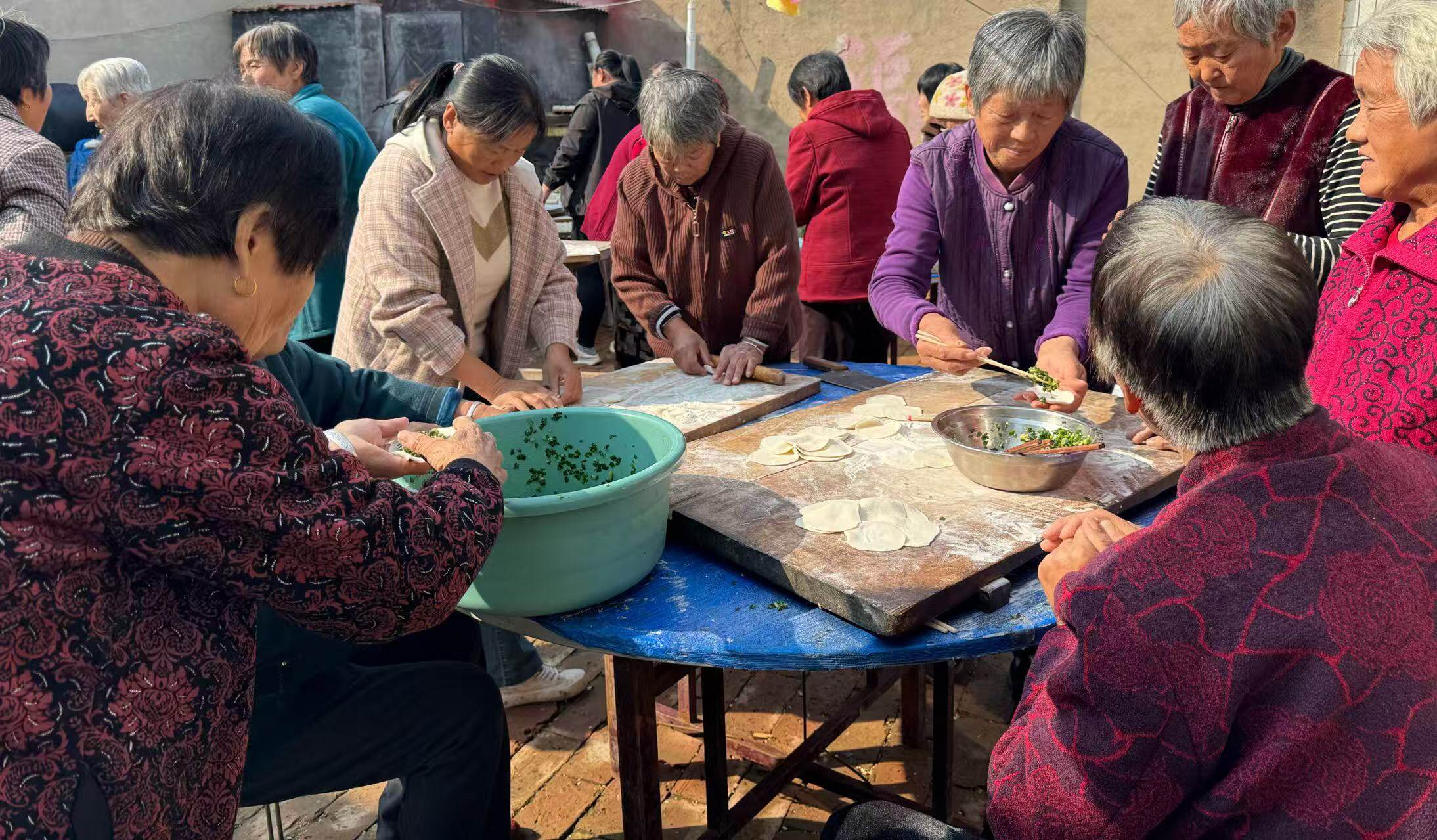 活动现场,处处洋溢着温馨热闹的气息。锣鼓声率先打破村庄的宁静,80多岁的鲍云增老人精神矍铄,手持鼓槌敲响锣鼓,铿锵有力的鼓点与欢快的节奏交织,引得在场村民纷纷驻足喝彩。另一旁,切菜、拌馅、和面、擀皮、包饺子,志愿者分工明确、默契十足,为老人包水饺。