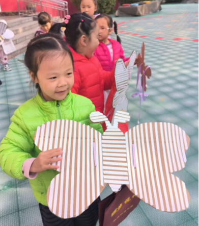 活动准备阶段,孩子们在家里与家长协作,以废旧纸壳为基底,借助双面胶、麻绳等材料,制作出一只只的“蝴蝶”。