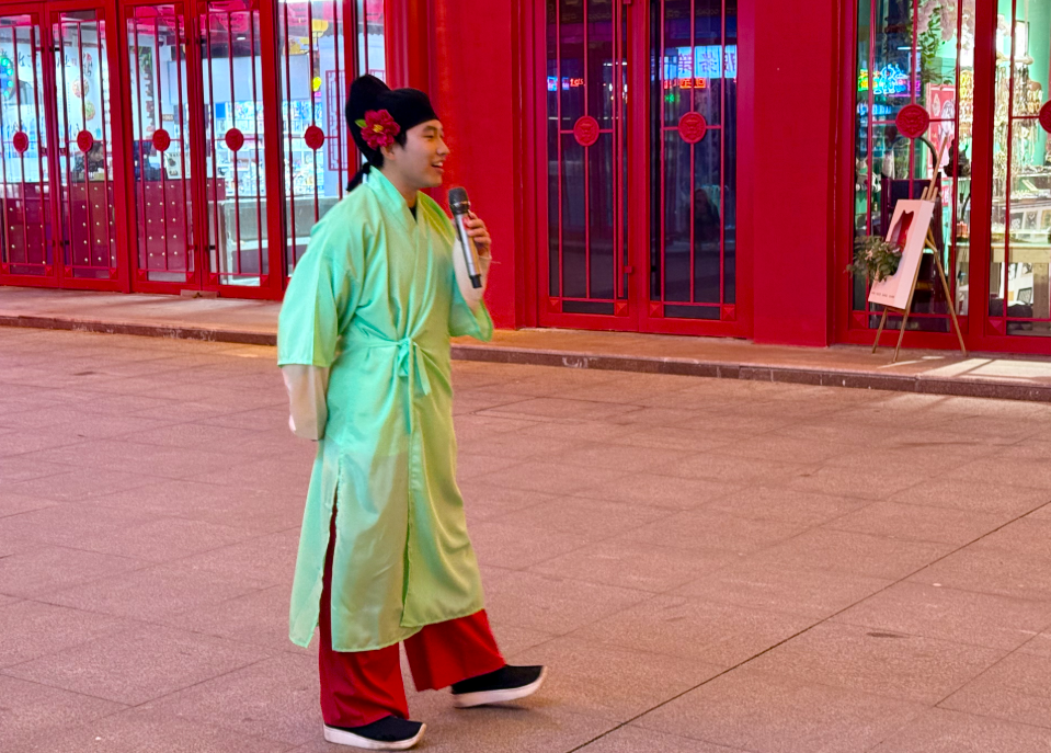 如今的周红明,还有一个重要身份——部门演出策划。伍捌玖街区深受游客欢迎的“梦回课堂”互动项目,以及多个快闪表演,都有他参与创作的痕迹。不过,从单纯的“表演者”转型为“策划者”,并非易事。尽管大学时担任过街舞社社长,有一定的组织经验,但节目创意、剧情文案、音乐制作、角色配音等工作,对他来说都是全新的领域。