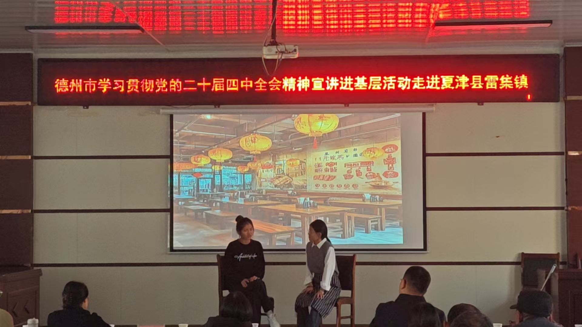 12月16日下午,“德院小青马・津津乐道”宣讲团走进夏津县雷集镇人民政府开展理论宣讲活动,以“情景剧+理论宣讲”的形式,为基层一线工作者宣讲党的二十届四中全会精神。