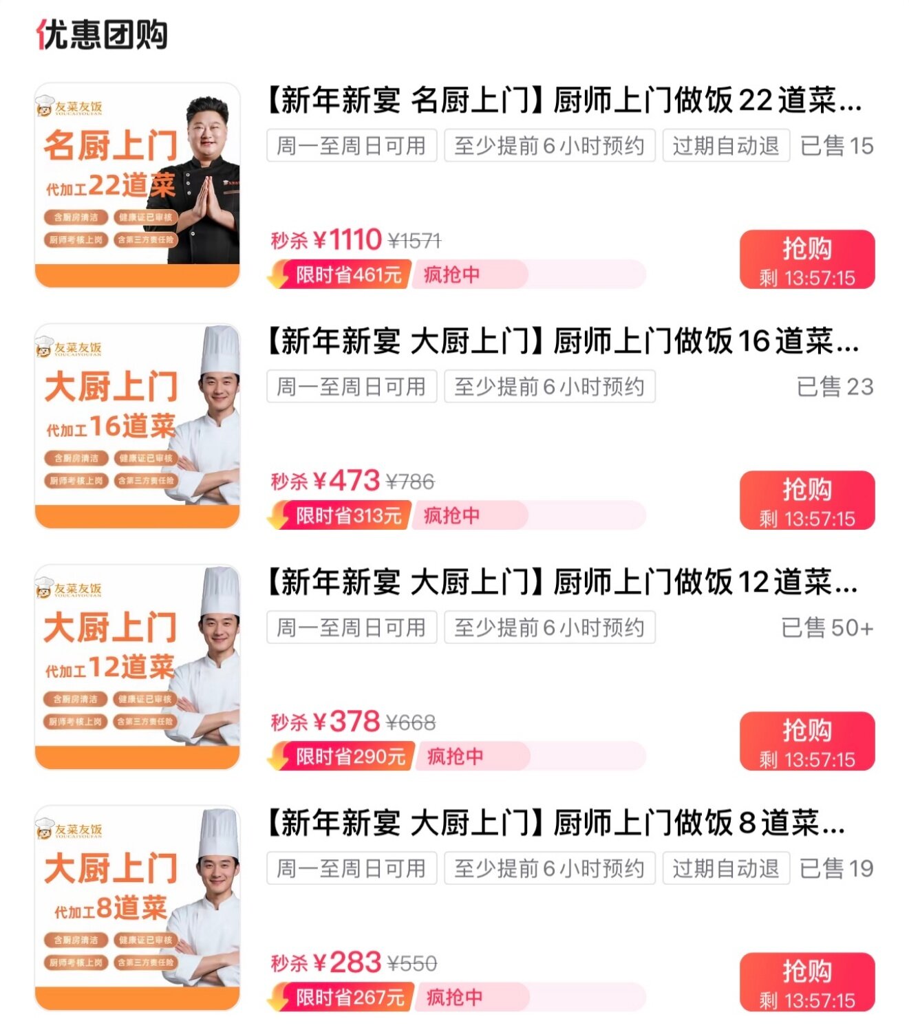 与此同时,记者在某网络平台上发现,年夜饭厨师上门团购套餐也已开启预售,其中12道菜的套餐已售出50多份,并标注“疯抢模式”。