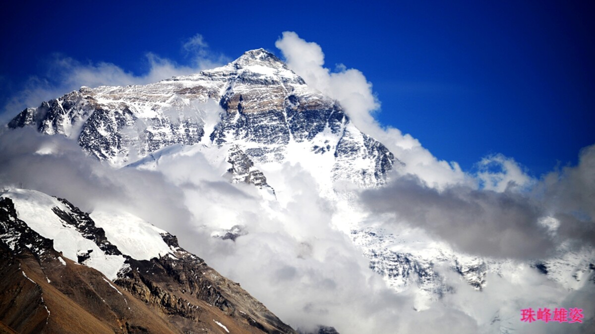 珠穆拉玛峰,围绕在山峰边的白云,如同雪白的哈达,飘逸在她的身边,使她更加妩媚多姿。