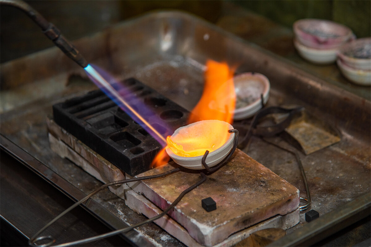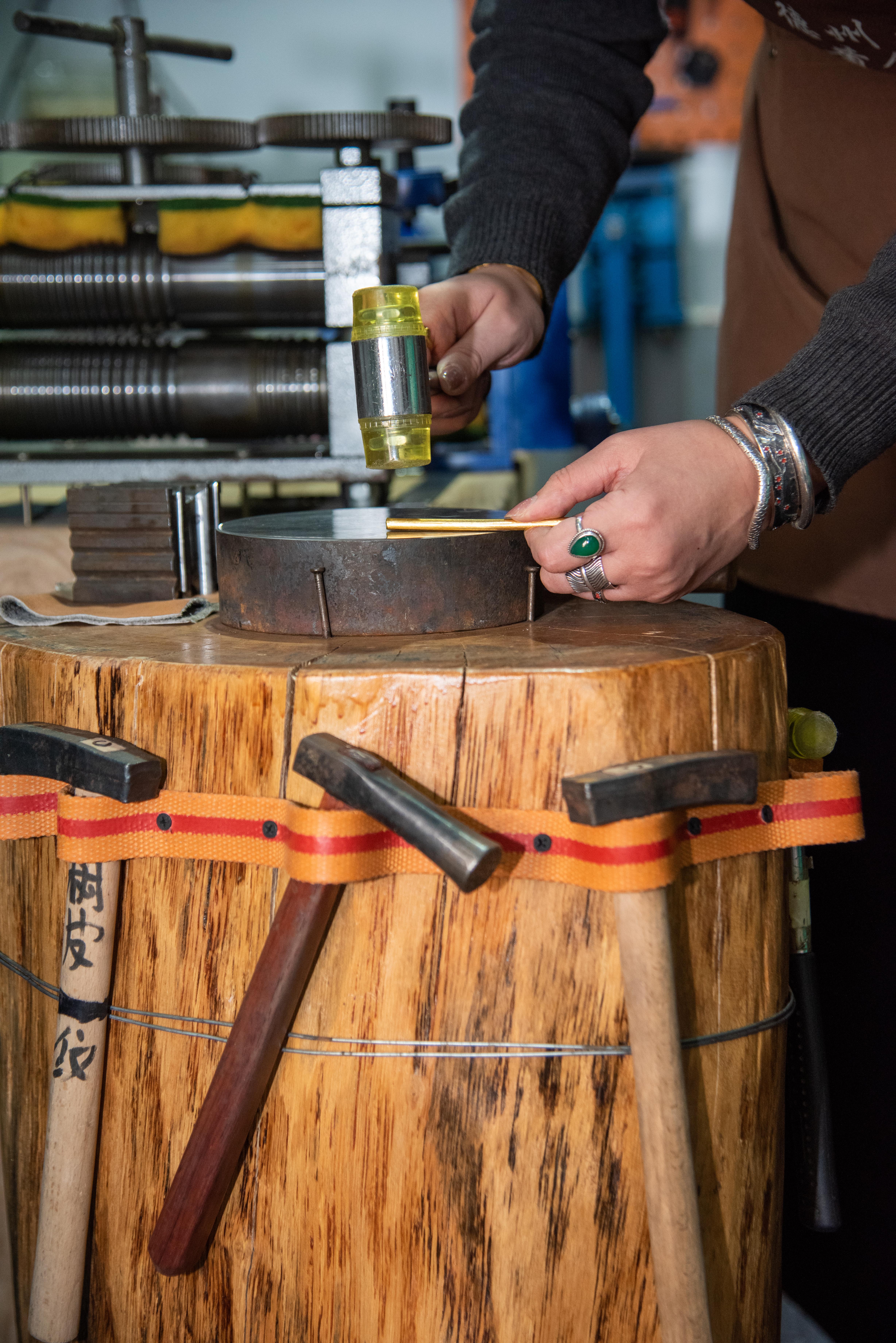 今年37岁的胡玥曾从事投资行业,因从小喜爱黄金首饰,于2022年专程赴深圳学习传统黄金加工技艺,同年10月回到德州开设了这间工作室。“从金条到首饰,需经过熔金、锻打、窝圈、焊接等十道工序。”她一边演示一边向记者介绍,手工打金主打性价比,手工费根据款式复杂程度不同收费也不同,每克手工费在9.9元至49元不等。以50克金饰为例,顾客自带金条,省去品牌溢价,仅需支付约1500元手工费,相比金店购买黄金饰品,可节省近万元。