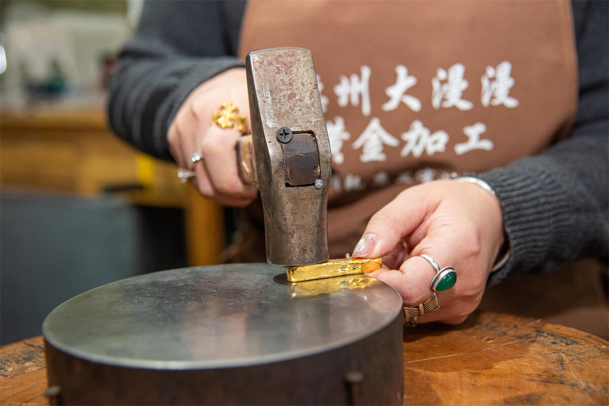 除了价格优势,打金也在款式与体验上吸引着新一代消费者。“泥鳅背、吉言等传统款式很受欢迎,也有很多客人将双方名字缩写刻在黄金饰品上,追求个性化设计。”胡玥坦言,这类年轻群体不仅看重实惠,更青睐亲手参与、现场见证的打造过程,这让传统金工技艺焕发新活力。