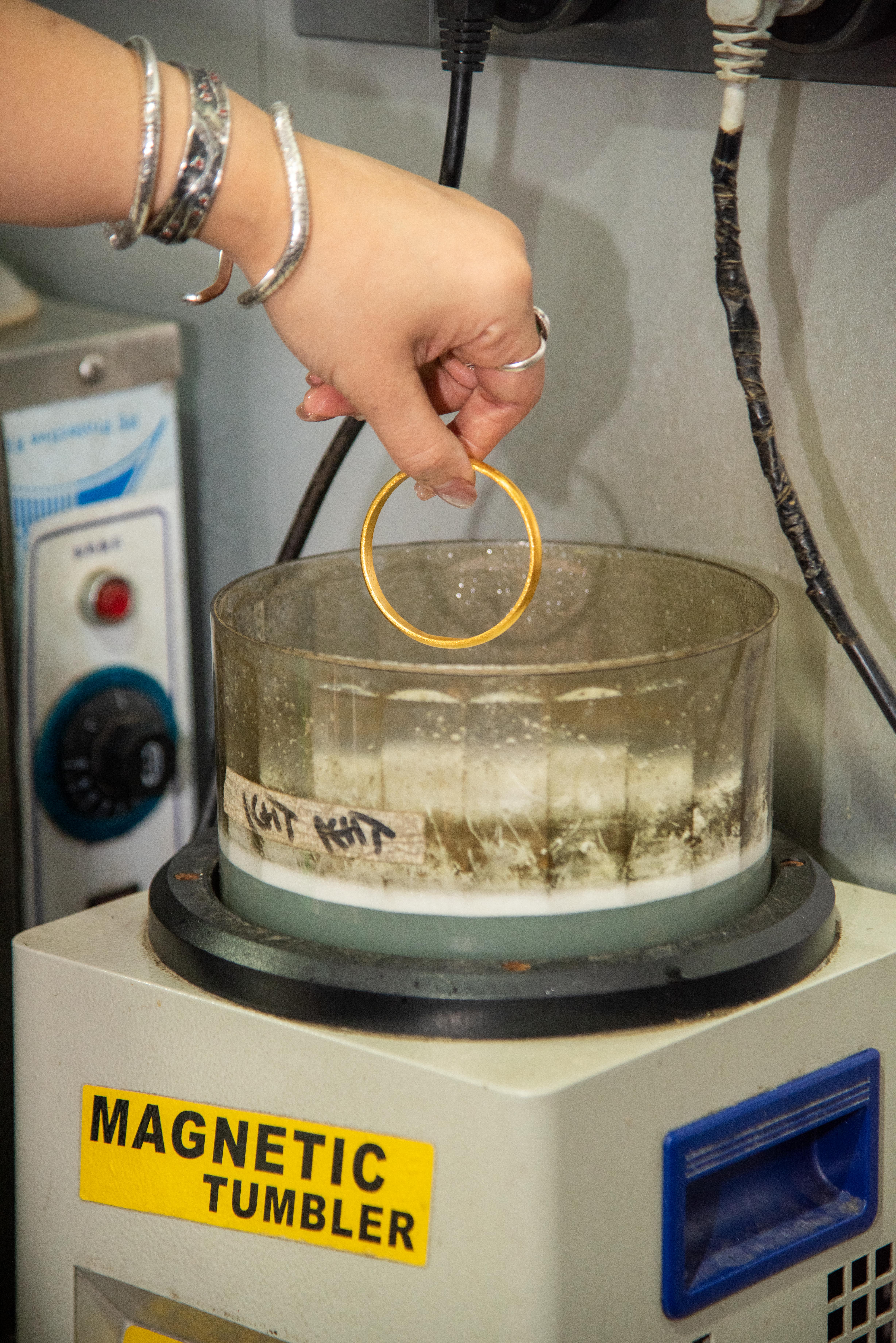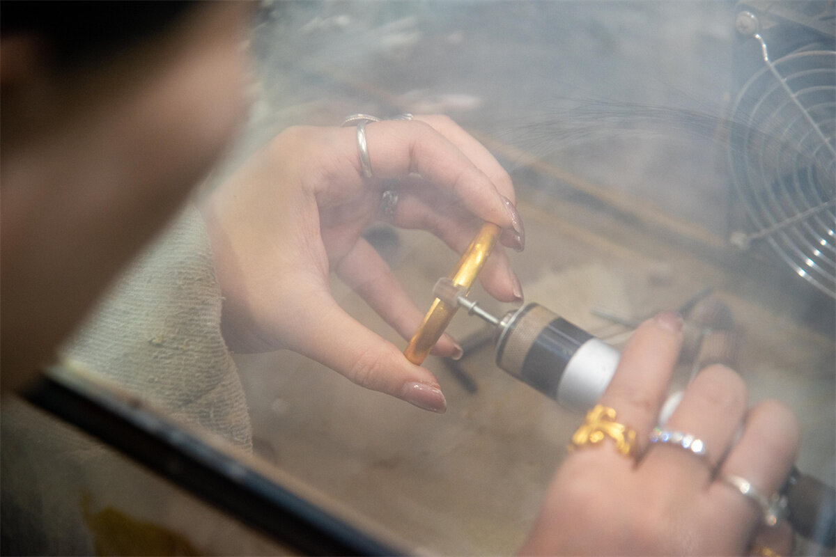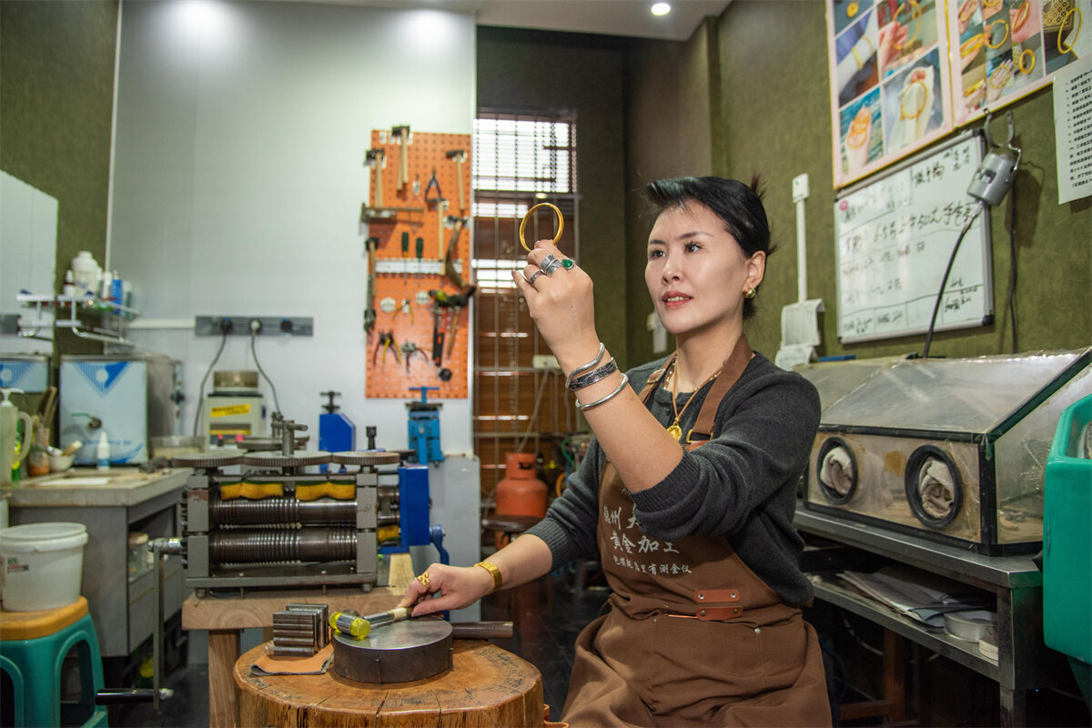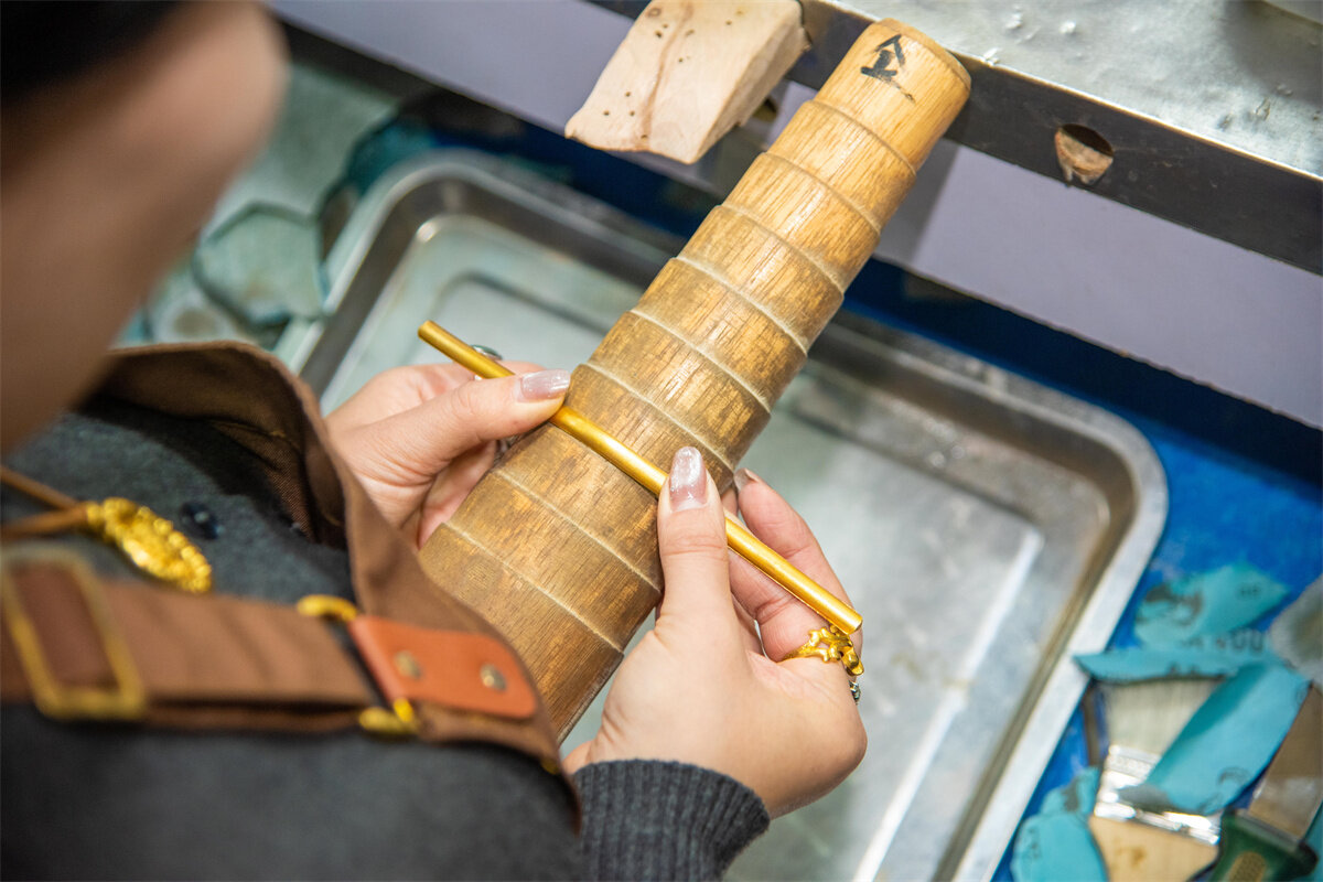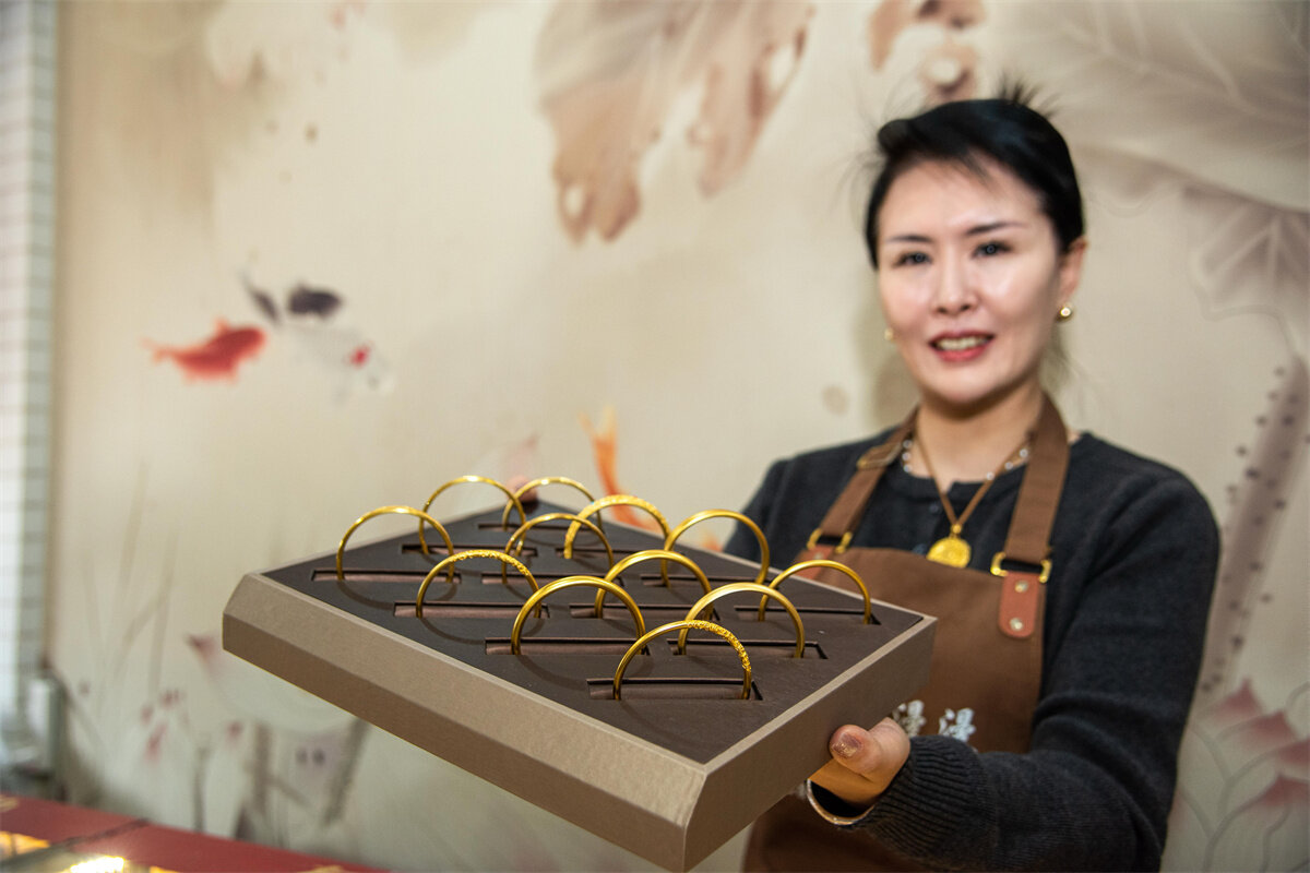 “年底订单多,经常加班到晚上10点左右。”胡玥表示,简单款手镯需1.5小时完成,她每日最多可制作10余件饰品,“‘三金’当天做当天取,很受年轻人欢迎。”