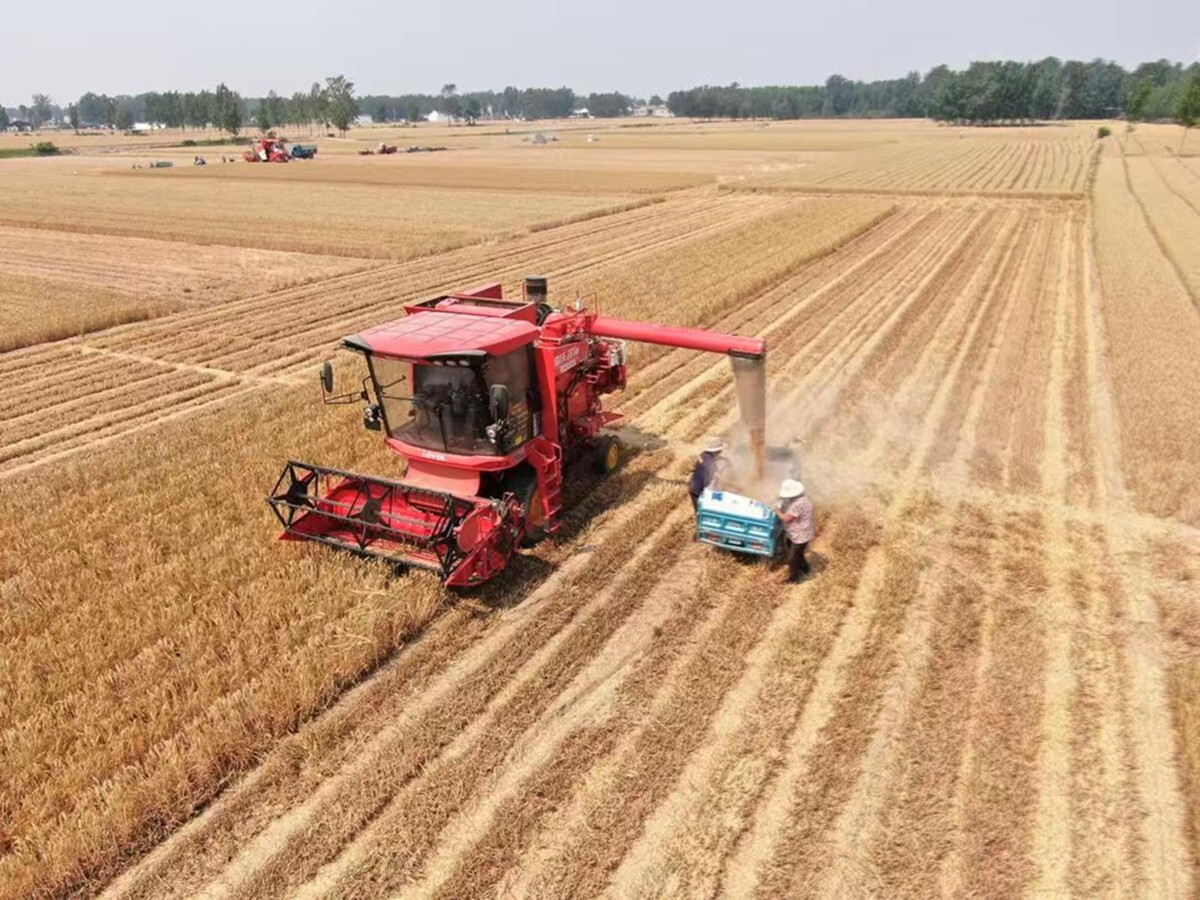 2025年6月9日,拍摄于德城区二屯镇,展示了新时代农村收麦场景,机械化收割。
