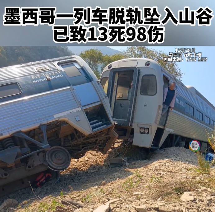 墨西哥一列车脱轨坠入山谷 已致13死98伤