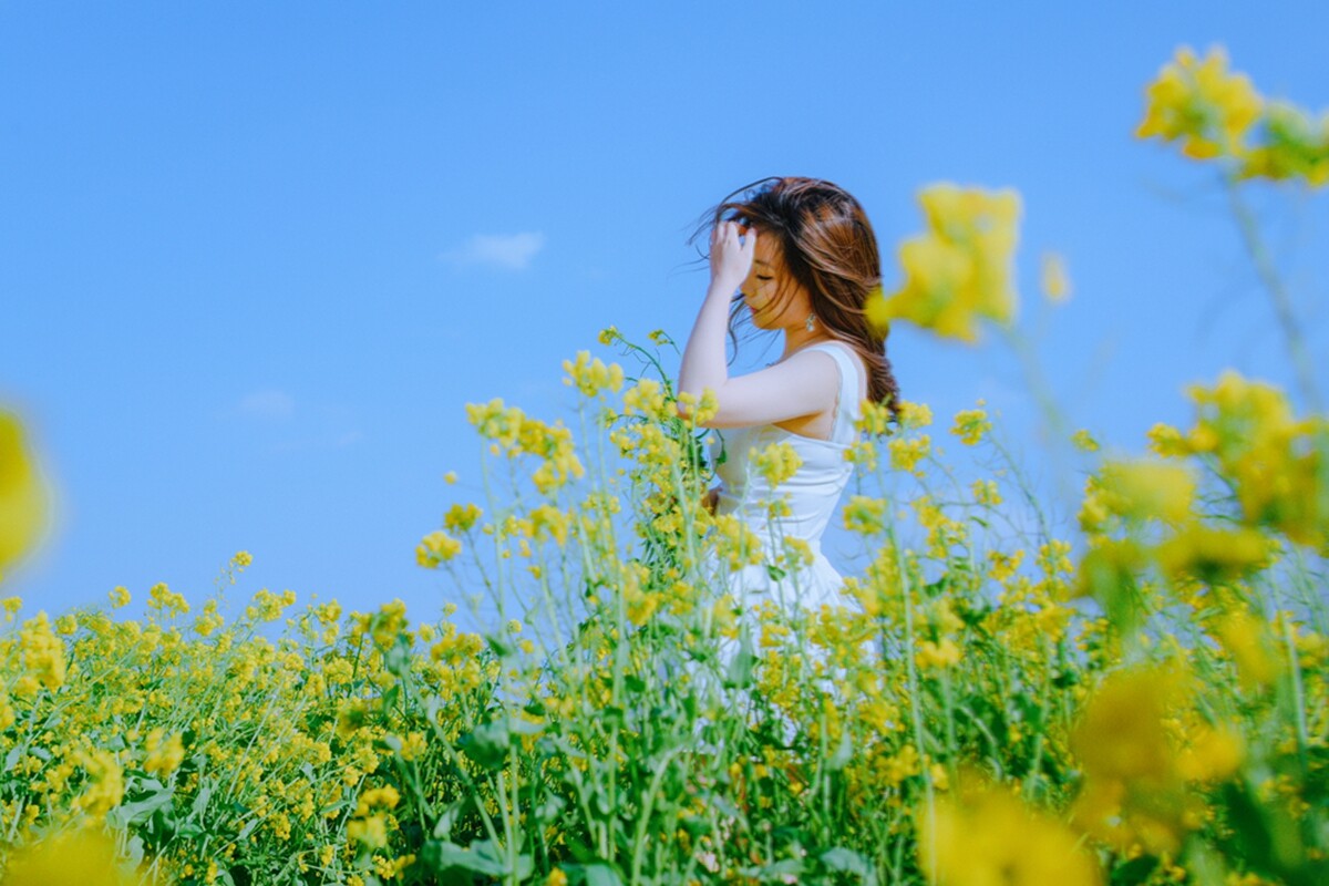 △《春风》少女在油菜花田中轻拂被风扰乱的发丝