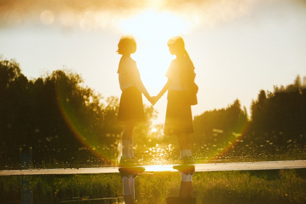 △《朋友圈》两名少女手拉手的倒影被夕阳的光影圈在一起