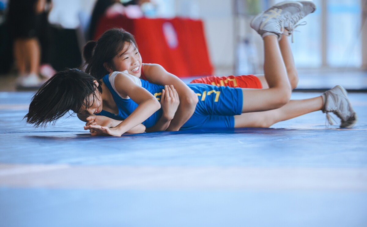 △《拥抱》2025山东省青少年国际式摔跤联赛,双胞胎姐妹面带笑容友好“切磋”
