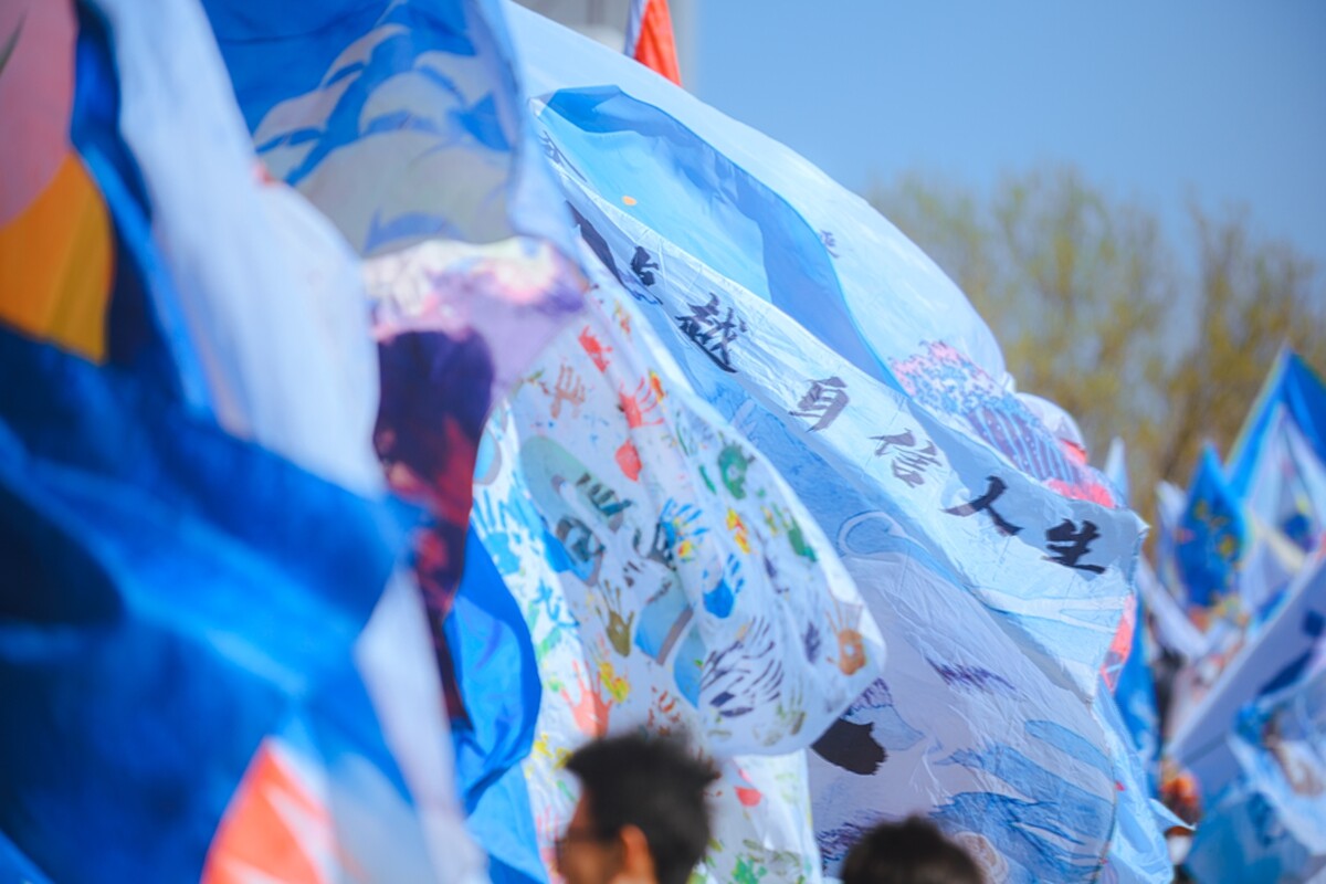 △《自信人生》德州市实验中学第十二届校园科技体育节开幕式上,各具特色的班旗迎风招展,像极了张扬恣意的青春