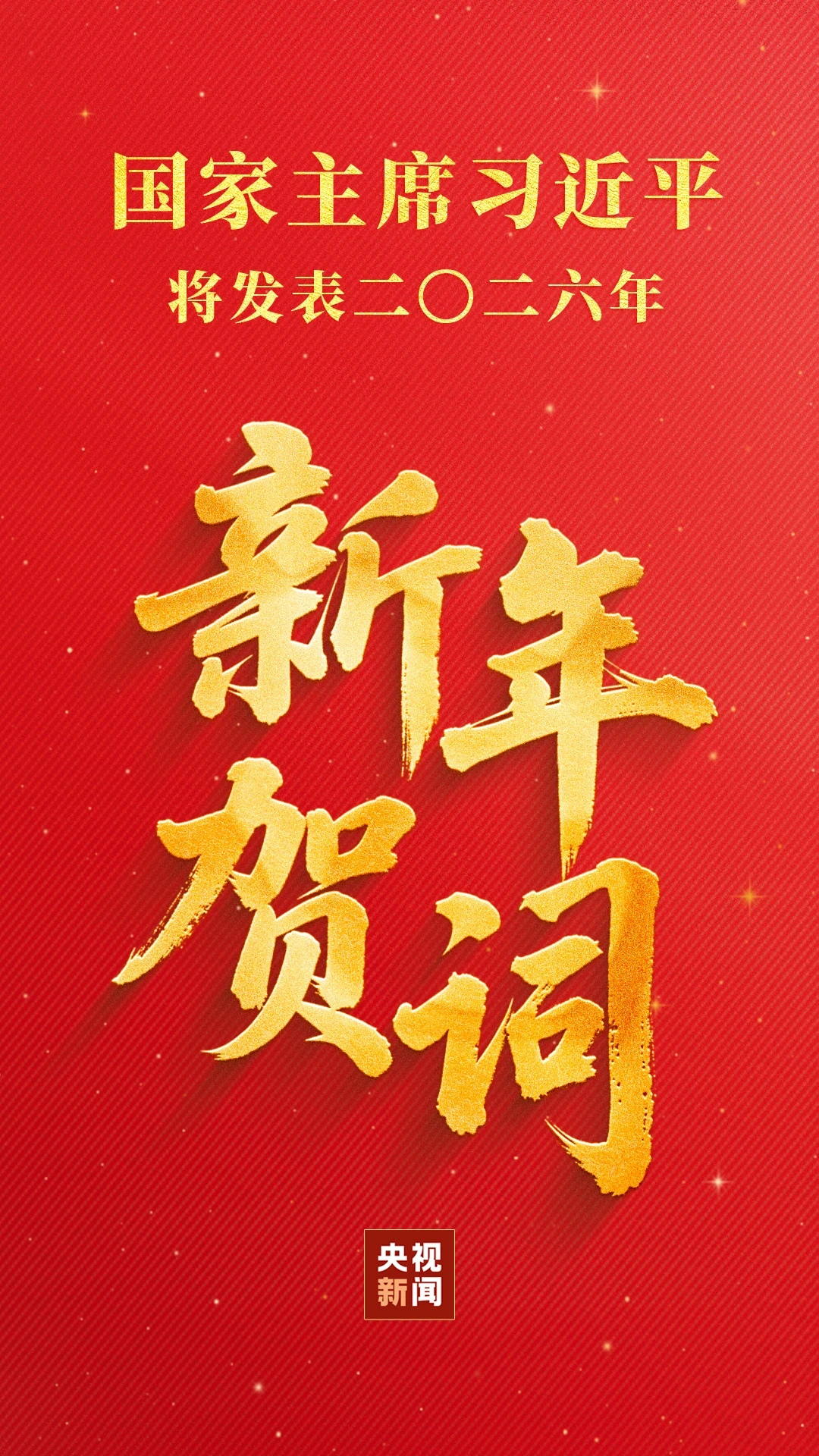 国家主席习近平将于31日晚7时通过中央广播电视总台和互联网,发表二〇二六年新年贺词。中央广播电视总台所属中央电视台综合频道、新闻频道、中文国际频道、4K频道,中国国际电视台各外语频道,中央人民广播电台,中国国际广播电台,以及人民网、新华网、央视新闻客户端等中央主要新闻媒体所属网站、新媒体平台将准时播出。据央视新闻