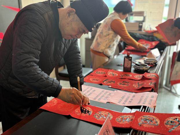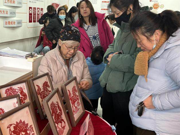 与此同时,社区一楼“幸福集市”热闹开市,墨香四溢、人头攒动。集市精心设置了毛笔书写春联、传统剪纸艺术、爱心跳蚤市场、公益理发等多个服务摊位。书法爱好者挥毫泼墨,一副副饱含祝福的春联跃然纸上;剪纸艺人巧手翻飞,窗花图案栩栩如生;跳蚤市场物物交换,传递绿色生活理念;公益理发摊位前排起长队,温暖服务直达居民心坎。居民们边逛边体验,在感受传统文化魅力的同时,也享受到了“家门口”的便民服务,切实感受到社区大家庭的关怀与温度。