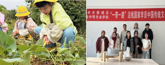 精准赋能,研学融合闯“新路”。立足本土实际,裴振国立足本土资源,摒弃传统路径依赖,瞄准研学旅行新赛道,投资建设占地25000平方米的雅韵研学旅行基地。基地坚持以党建为引领,深度融合“文化+教育+旅游+农业”,巧妙整合廉颇文化遗址、东方朔书画院、“朔之乡”剪纸非遗等本土文化名片,精心打造农耕体验区、航天科普馆等多元实践场景,构建起内涵丰富的综合性实践教育平台。其中,“认种一块地”农耕项目,将农田变为生动的“班级责任田”,实现了劳动教育与学科知识的有机融合。目前,基地日接待能力达500人次,影响力辐射周边百公里,不仅成为本地中小学实践教育的首选基地,也吸引了众多外国友人前来体验中华传统文化魅力。