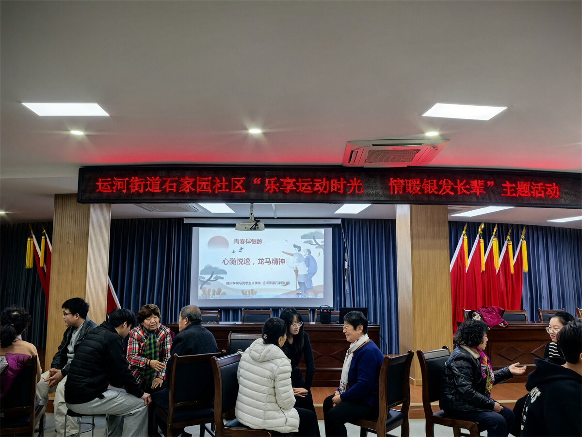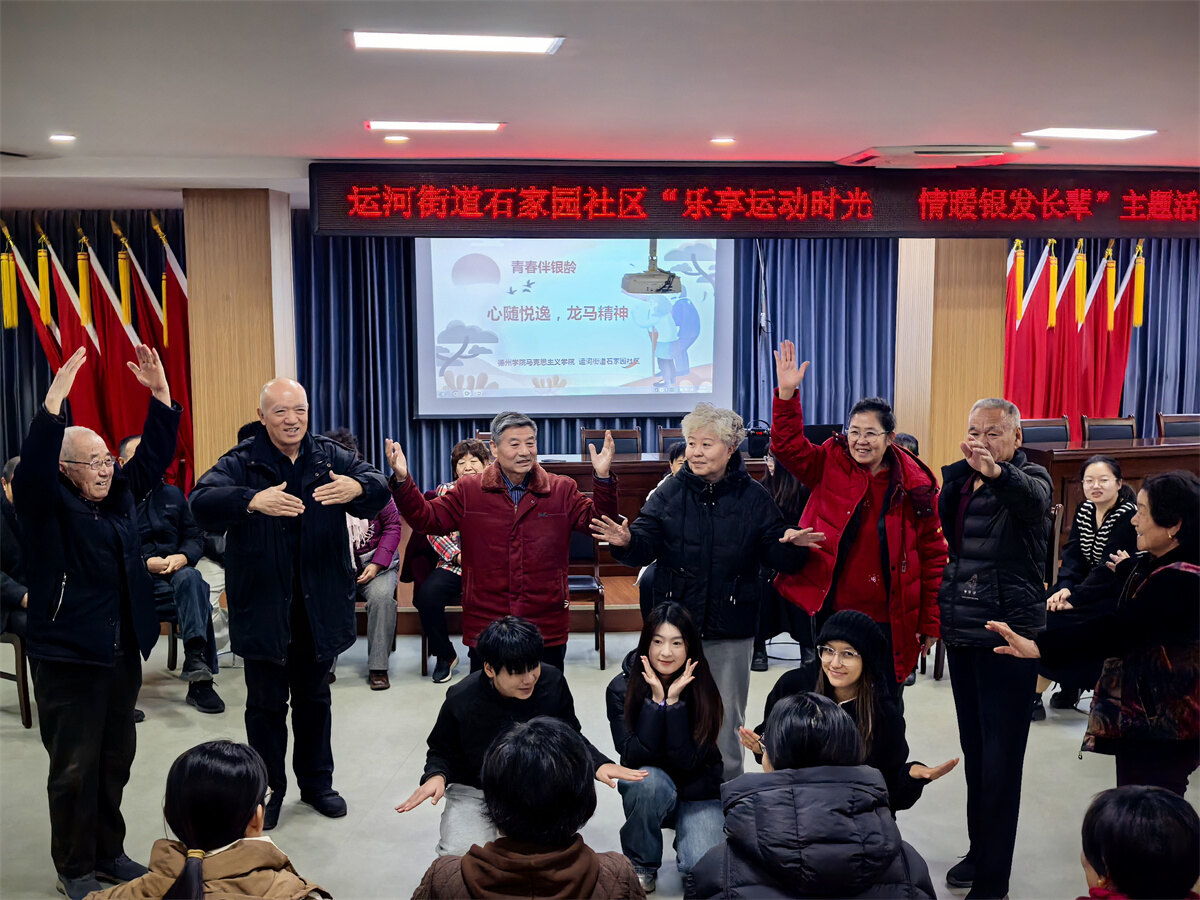 辞旧迎新之际,为弘扬中华敬老美德,满足老年人日益增长的美好生活需要,助力构建老年友好型社会,1月7日,德州学院马克思主义学院在运河街道石家园社区开展了一场别开生面的暖心助老活动。活动由国家二级心理咨询师、注册心理师孙爱军带领,马克思主义学院大学生志愿者与社区老人共同参与。活动充分发挥青银双方的优势资源,实现双向赋能,将中华优秀传统文化、红色文化与积极心理学、现代音乐舞动元素有机融合,在传承与创新中有效提升两代人的积极心理品质,增强双方的价值感、幸福感;促进代际间的理解与沟通,共享共创幸福时光;同时协助老人跨越数字鸿沟,解决手机使用困扰。