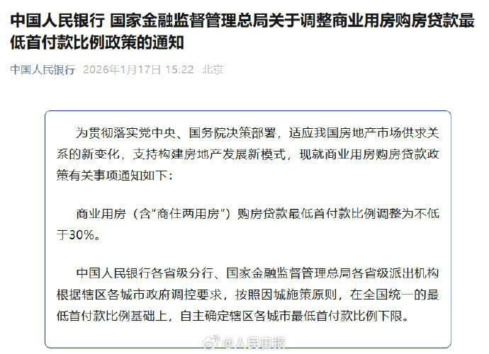 中国人民银行、国家金融监督管理总局发布关于调整商业用房购房贷款最低首付款比例政策的通知。为贯彻落实党中央、国务院决策部署,适应我国房地产市场供求关系的新变化,支持构建房地产发展新模式,现就商业用房购房贷款政策有关事项通知如下:商业用房(含“商住两用房”)购房贷款最低首付款比例调整为不低于30%。据人民日报