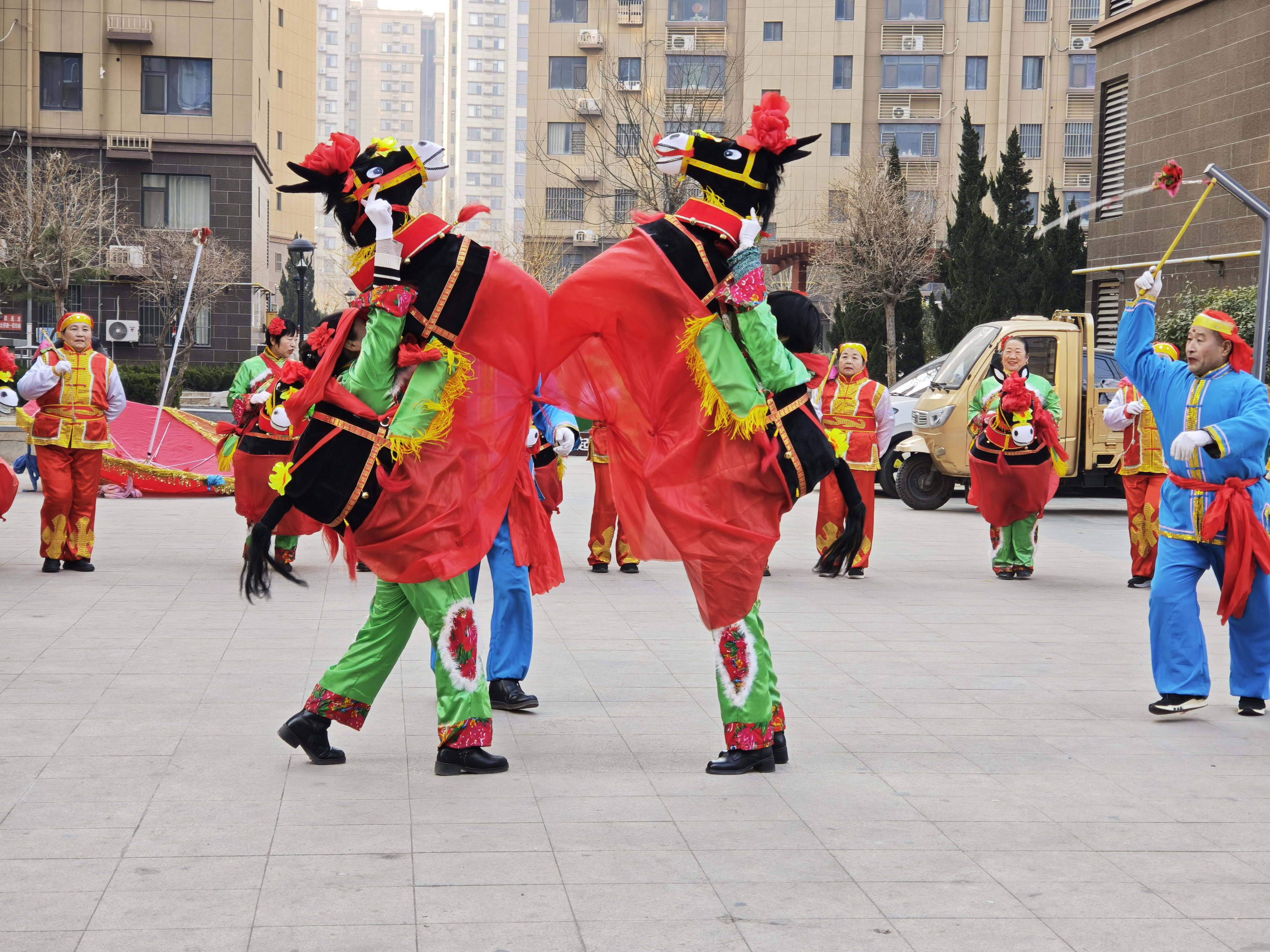 活动现场,书法协会的老师们挥毫泼墨,为居民书写寓意吉祥的春联和“福”字,传递浓浓年味与真挚祝福。同时,热闹欢腾的传统民俗跑驴表演在同心圆小广场上演。