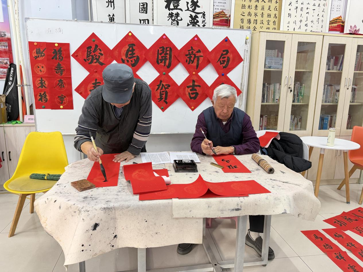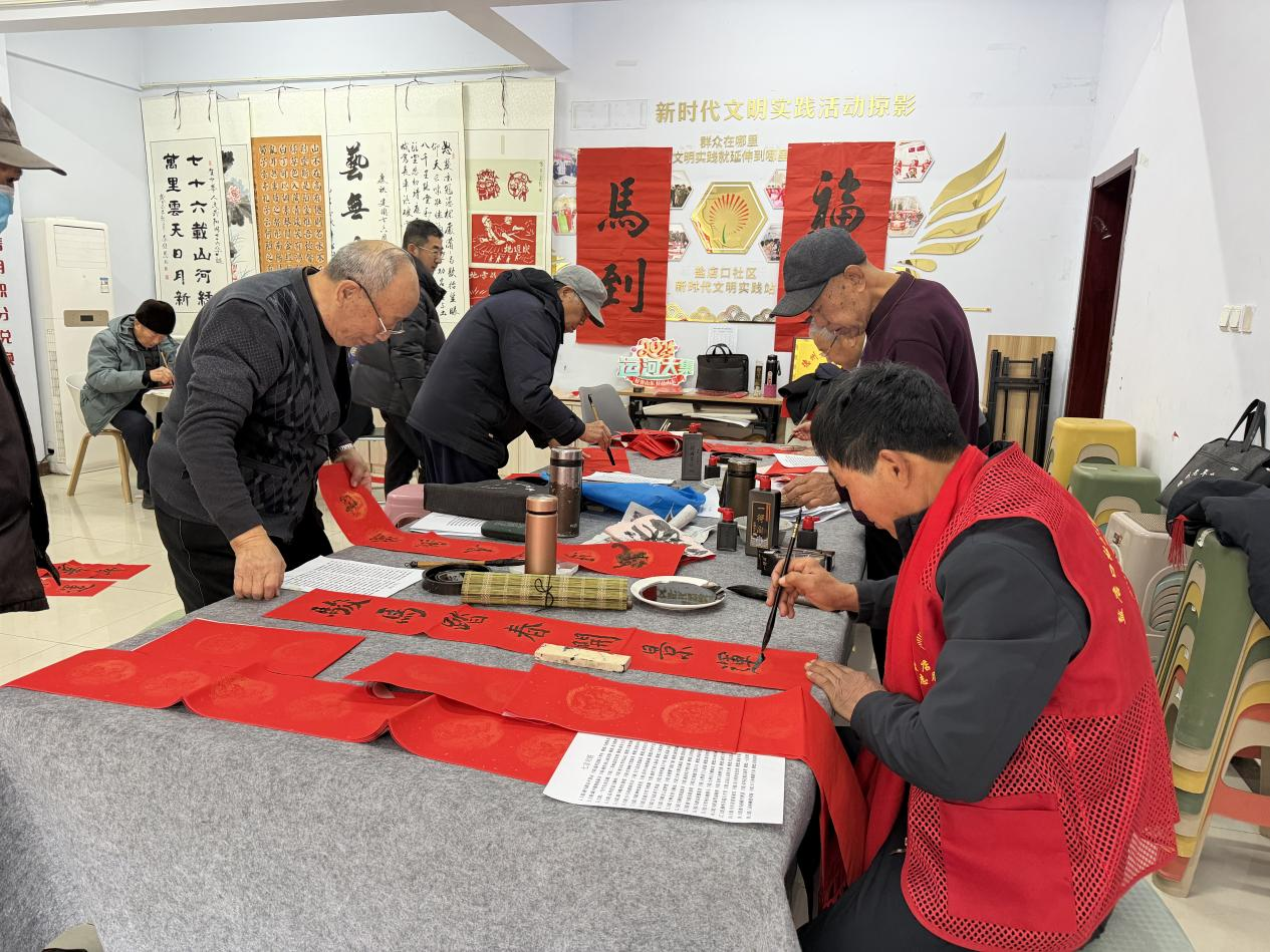 活动现场,盐店口社区书画社的十余位老师与到场居民亲切互动、交流技艺。书法老师们笔下的春联,或楷或隶,笔画或苍劲、或飘逸、或挺拔,春联与“福”字内容丰富多彩,红彤彤的纸张铺满一地,既烘托出辞旧迎新的浓厚喜庆氛围,也寄托着大家对丙午马年美好生活的热切期盼。闻讯而来的居民一边欣赏着老师们的书法创作,一边品评着春联上的文字。一位居民笑着说:“手写春联比印刷得有心意,贴门上年味儿更足!”到场的每个居民都挑选到了自己心仪的春联和“福”字。