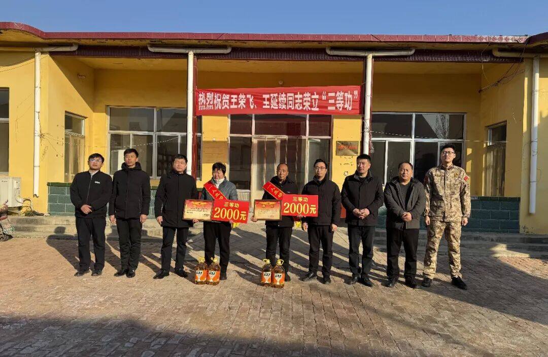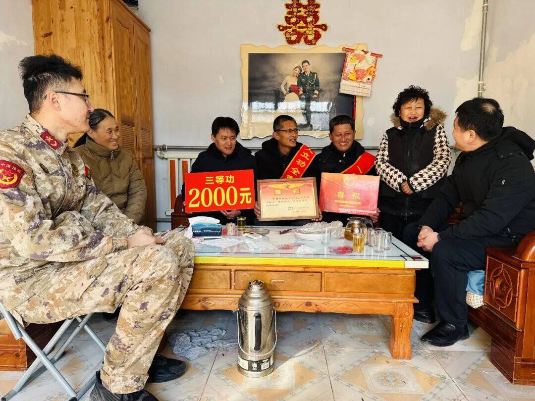 1月22日,庆云县退役军人事务局联合尚堂镇、崔口镇、徐园子乡及庆云邮政分公司,分别为尚堂镇大王村现役军人王荣飞和王延续、大靳村现役军人靳怀松、马家村退役军人周浩、崔口镇东北村现役军人刘东宇、徐园子乡张培元村现役军人张海川等家庭,送去三等功立功喜报、立功奖牌和慰问金。