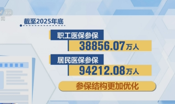 截至2025年底,职工医保参保38856.07万人,居民医保参保94212.08万人,参保结构更加优化。