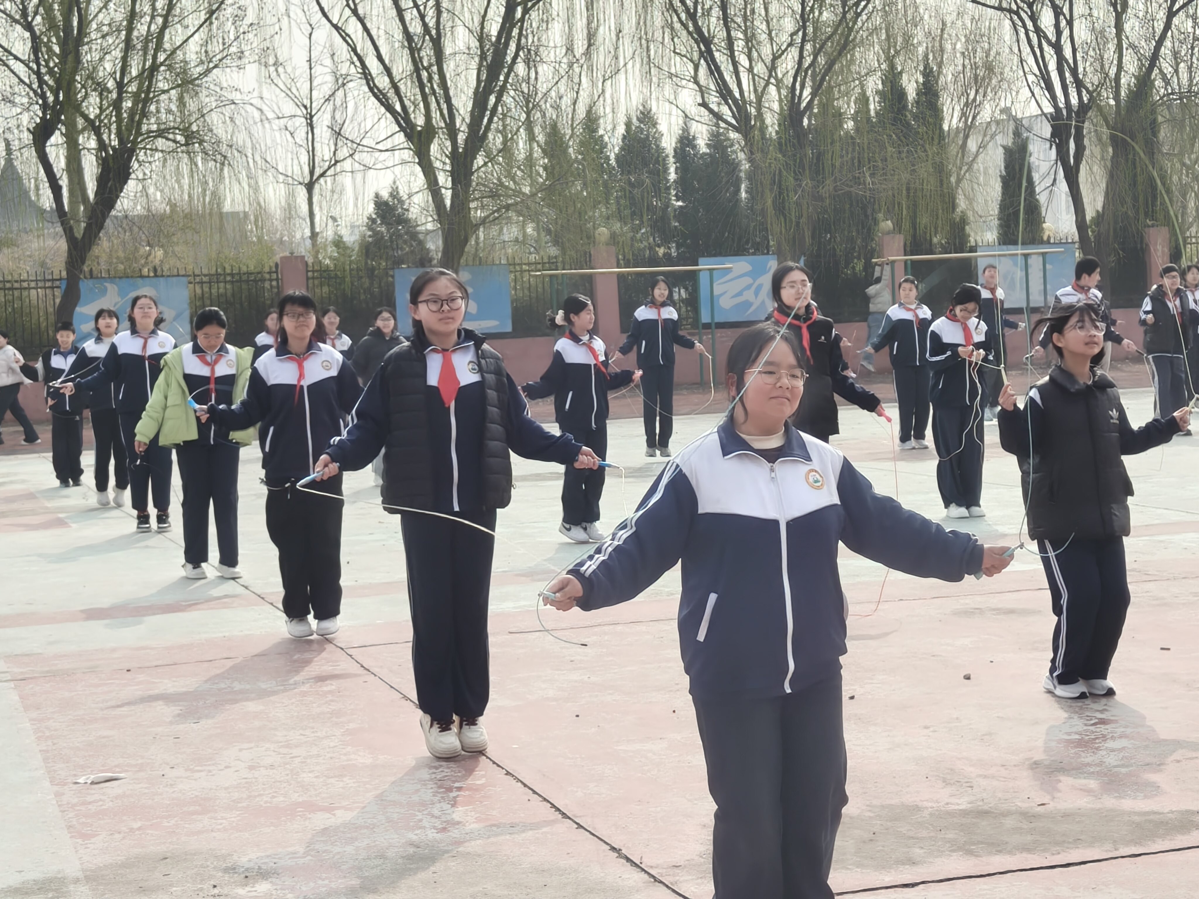 韵律操结束后,全员跳绳环节火热开启。五彩斑斓的跳绳在同学们手中翻飞,轻盈的身影在操场上跳跃,清脆的跳绳声与欢快的呐喊声交织在一起,整个操场变成了欢乐的运动海洋。小小的跳绳,不仅锻炼了学生的体能,更培养了他们的专注力、耐力与团队协作意识,让大课间真正成为学生放松身心、增强体质的活力加油站。