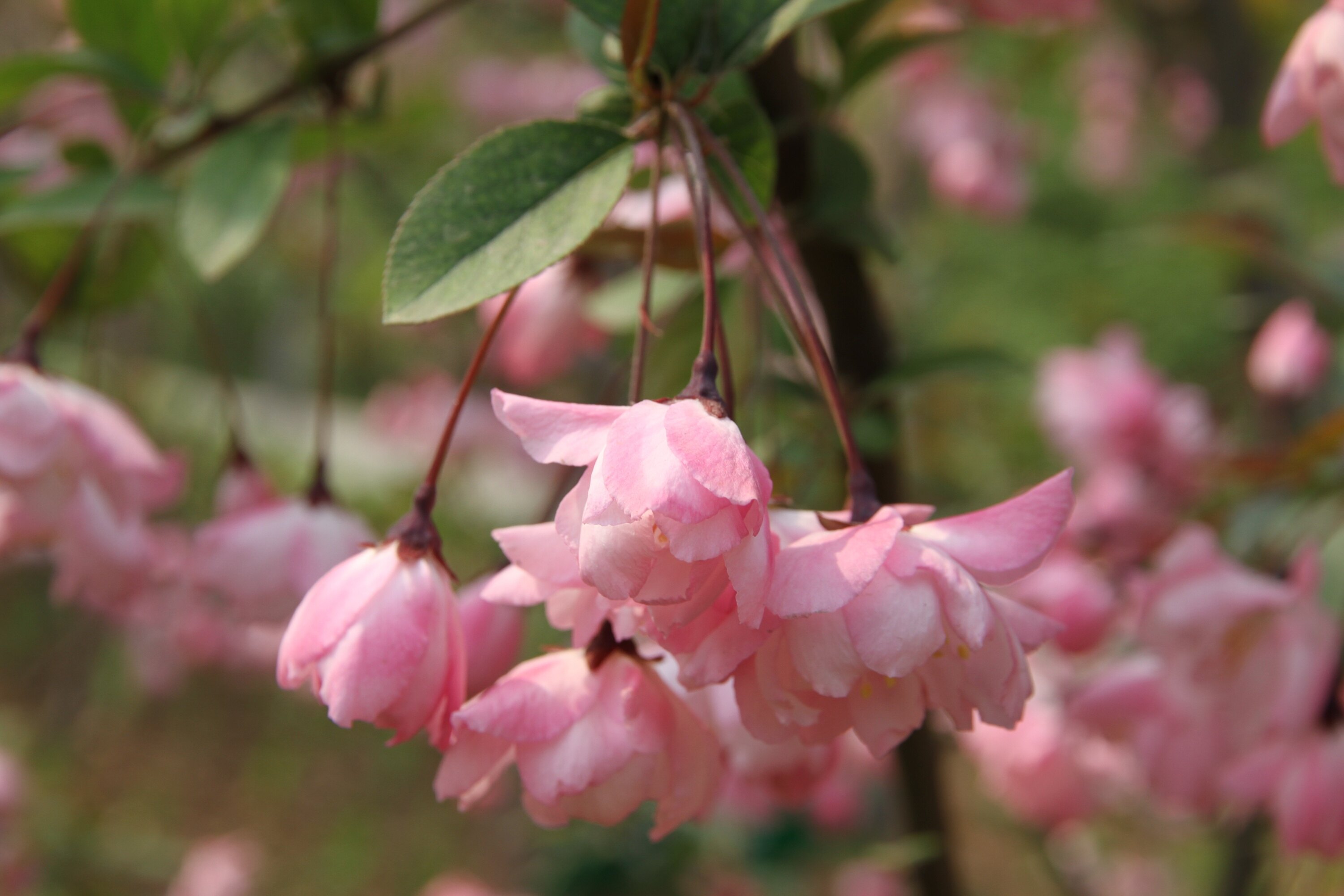 垂丝海棠:鲜玫瑰红,朵朵下垂,娇柔红艳