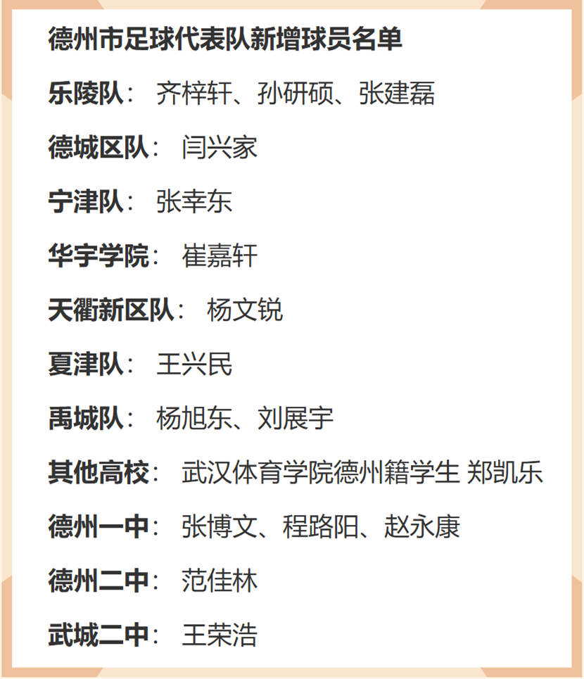 近日,征战2026年齐鲁超赛的德州市足球代表队阵容正式敲定。在前期公开选拔和严格评审的基础上,德州市足球协会公布了代表德州市出征的新增球员名单。新一届德州队以“老带新”为架构,既保留了上赛季的主力班底,又吸纳了来自全市各县(市、区)及高校的十余位精兵强将,同时还补充了来自德州一中、德州二中、武城二中的五名“08后”潜力新星。(查看更多)