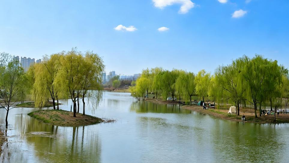 河畔柳堤上新柳抽芽,柳枝依依随风轻摆,倒映在澄澈的河面上,勾勒出温婉的春日水岸风光。不少市民漫步柳堤,踩着柔和的春光,听着潺潺流水声,感受微凉的清风拂过脸颊,惬意又舒心。