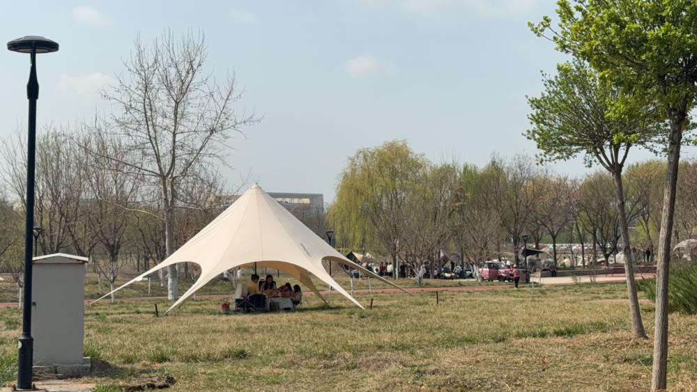 景区里开阔舒展的露天大草坪,是当之无愧的人气“C位”。暖阳倾洒,青草茵茵,市民们携家带口、邀约好友,早早赶来抢占心仪的露营点位。大家熟练地支起各色帐篷、铺好软糯的野餐垫,摆上精心准备的零食、水果与下午茶,一家人围坐闲谈,好友们举杯畅聊,孩子们在草坪上肆意奔跑撒欢。