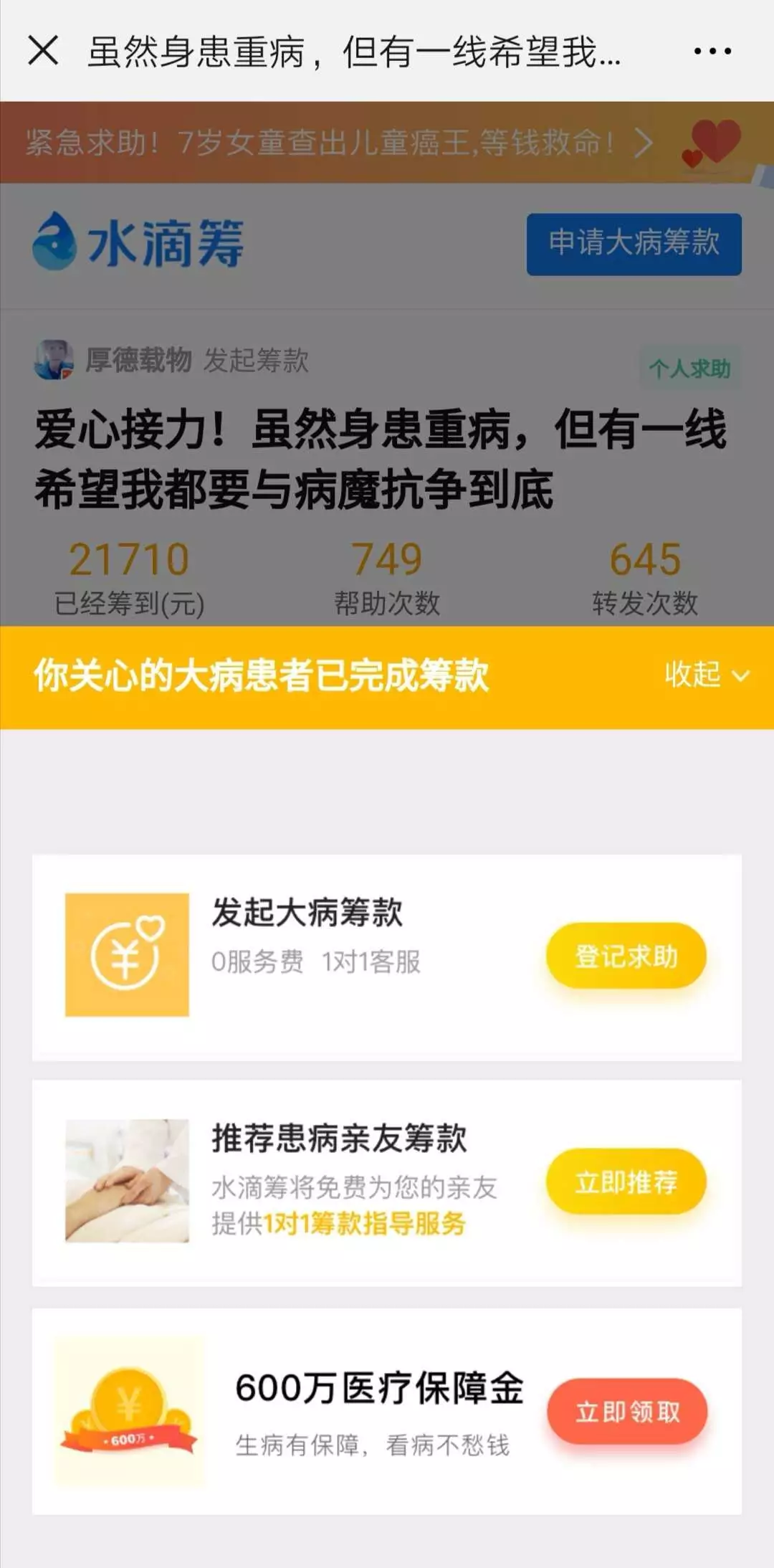 水滴筹、水滴互助、水滴保均使用过的网民表示,在水滴互助投一点小钱帮助别人,万一生病,又能得到别人的帮助,哪不用这么点钱啊?“既然在关注互助,肯定还是看重身体健康,于是又买保险。”