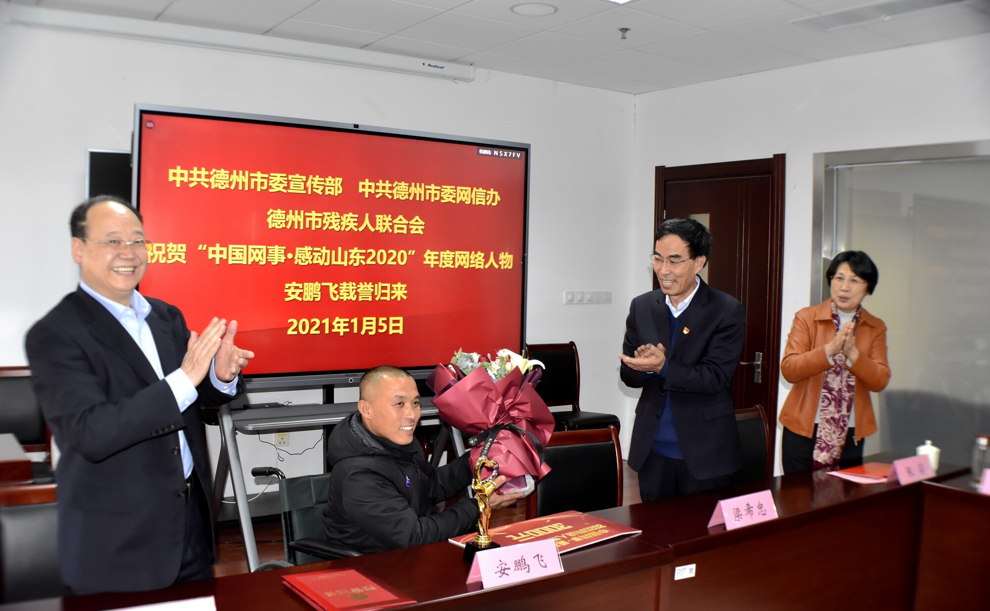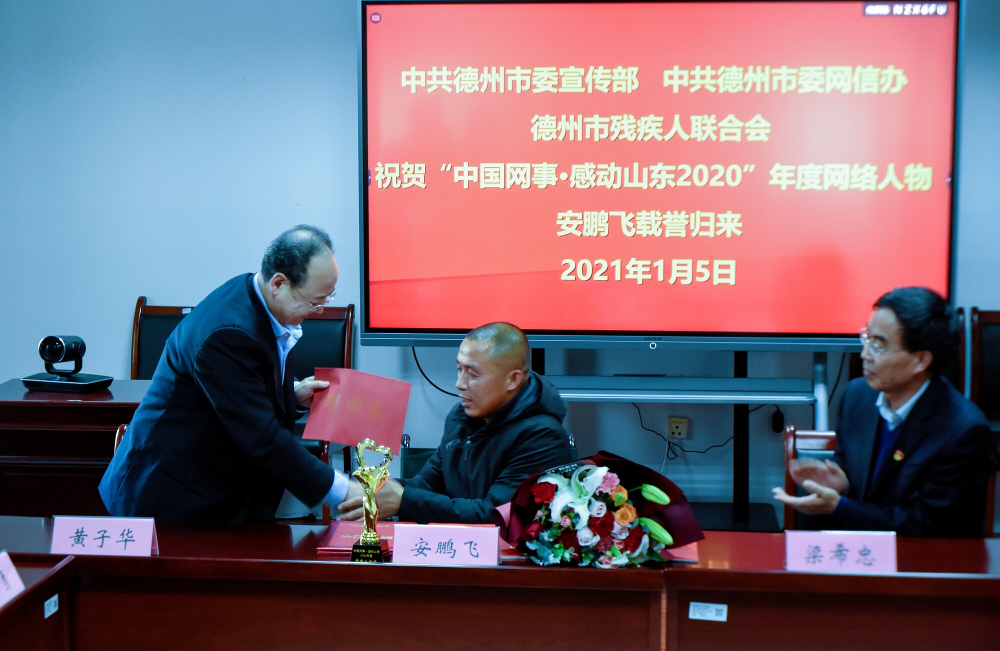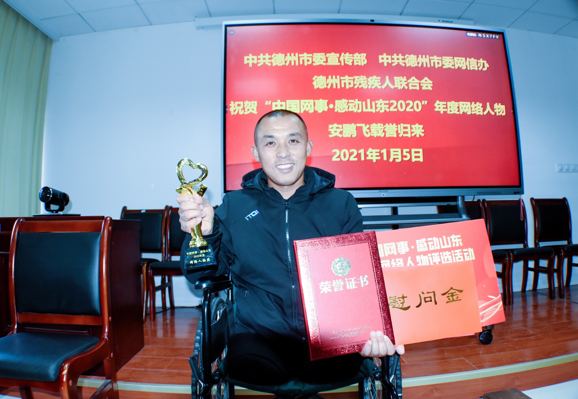 2020年12月,省委网信办与新华网共同主办了“中国网事·感动山东2020”年度网络人物评选活动,德州市推送了“无腿乐哥”安鹏飞等9名网络人物参加评选。全省共评选出10名年度网络人物,安鹏飞名列其中,并参加了全省“中国网事·感动山东2020”年度网络人物颁奖典礼。