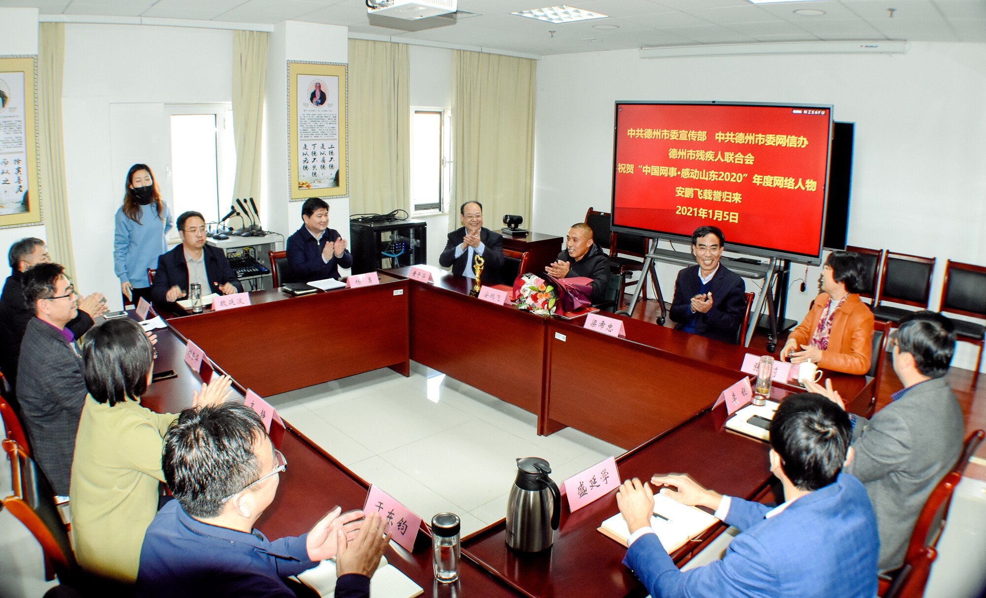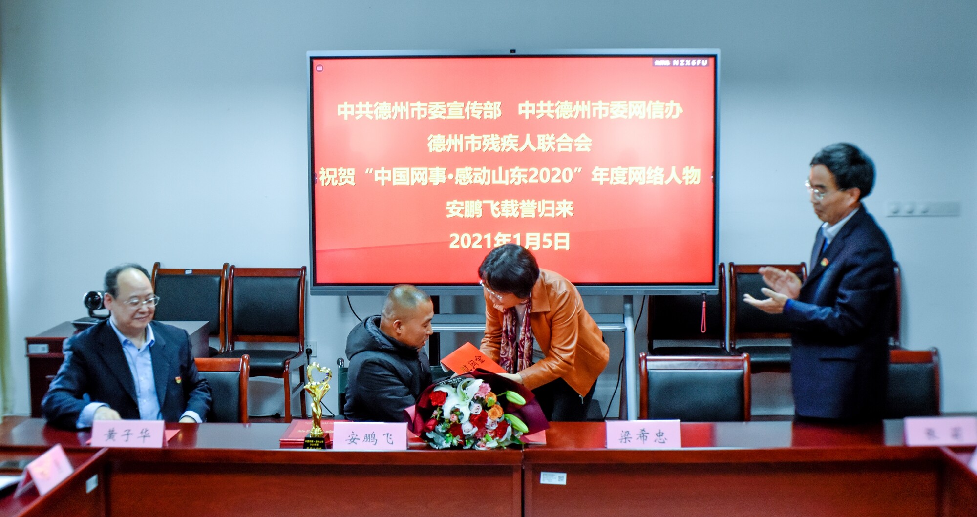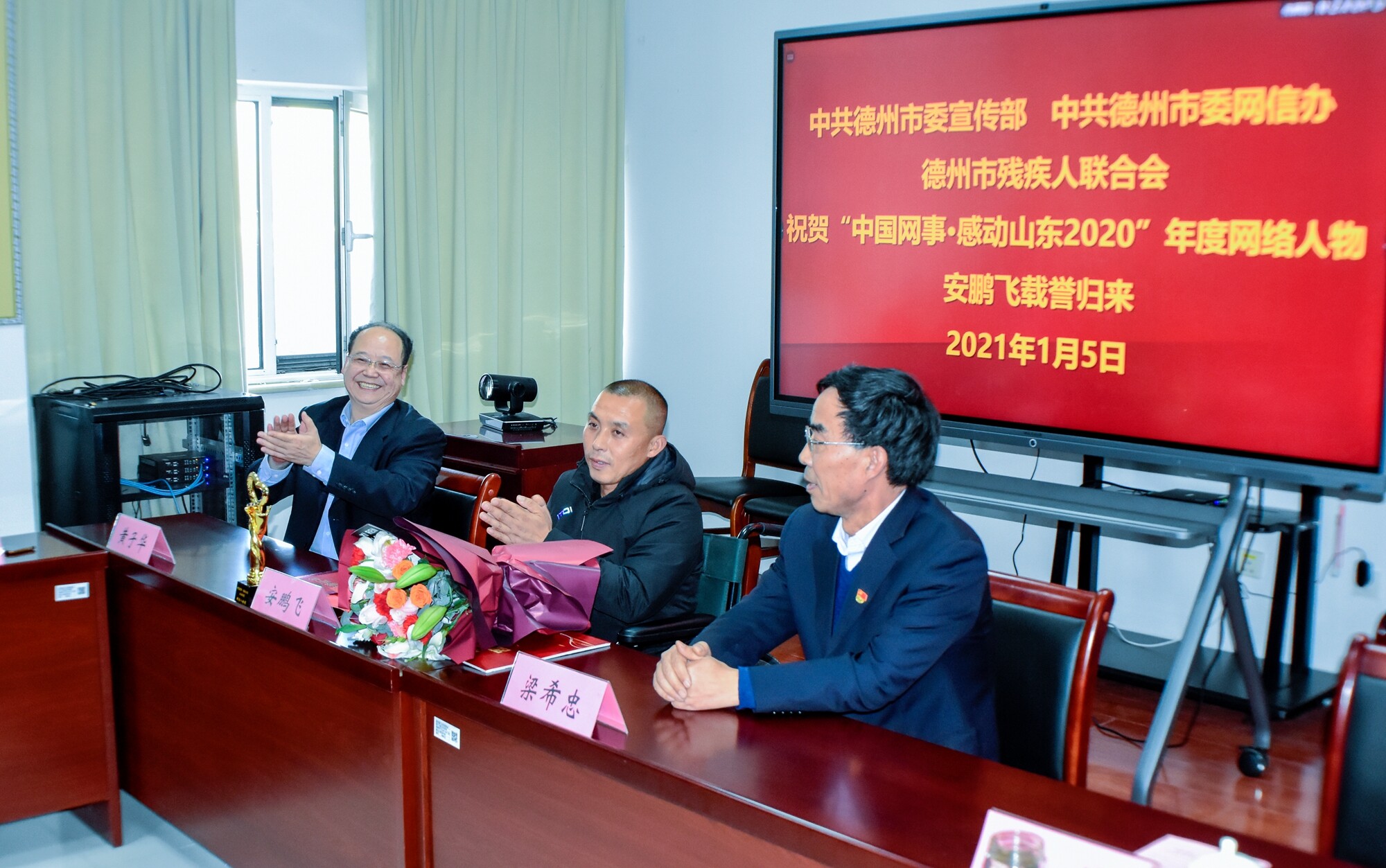2020年12月,省委网信办与新华网共同主办了“中国网事·感动山东2020”年度网络人物评选活动,德州市推送了“无腿乐哥”安鹏飞等9名网络人物参加评选。全省共评选出10名年度网络人物,安鹏飞名列其中,并参加了全省“中国网事·感动山东2020”年度网络人物颁奖典礼。