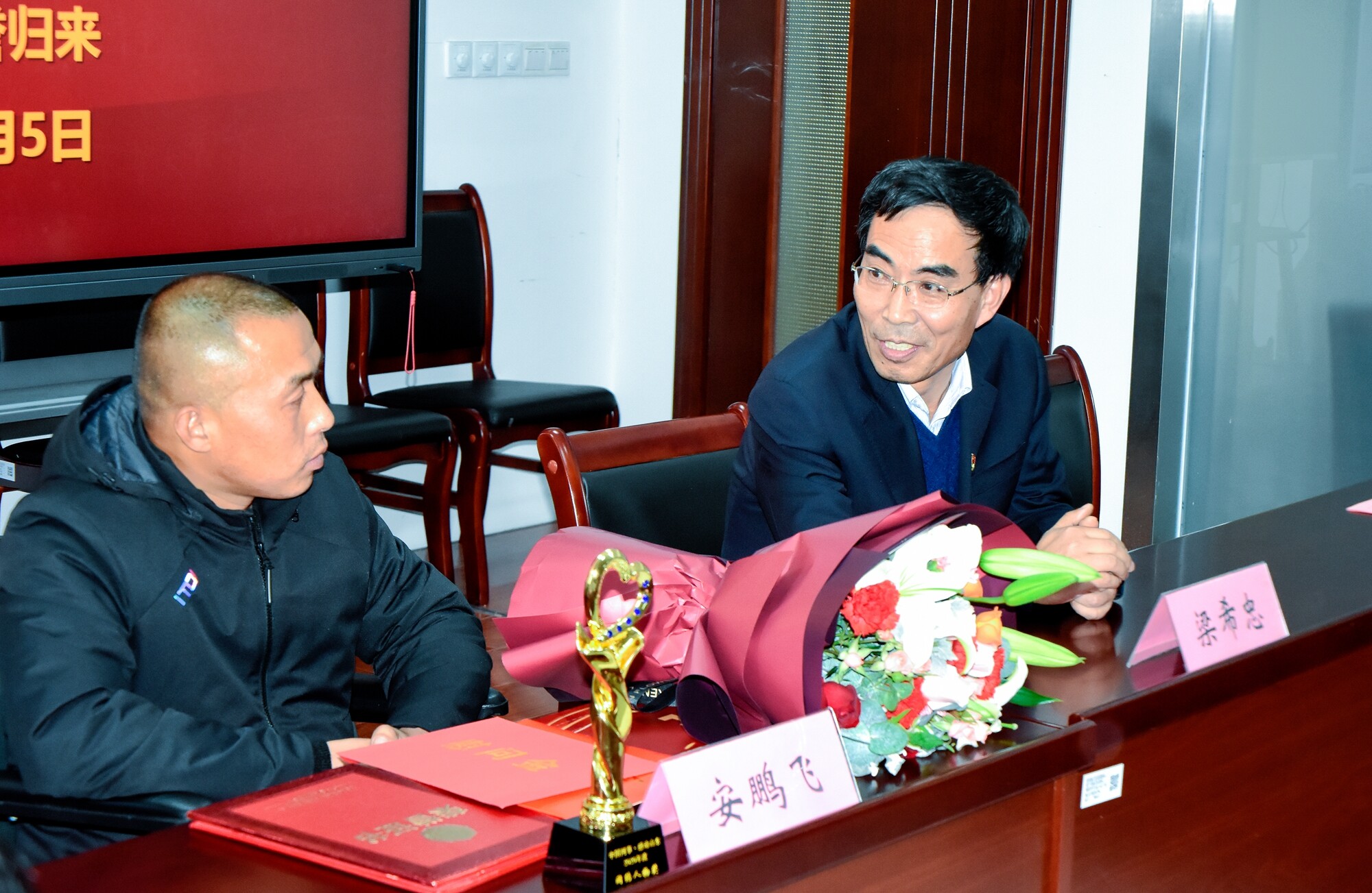 ▲市委宣传部主持日常工作的副部长梁希忠为安鹏飞送上鲜花