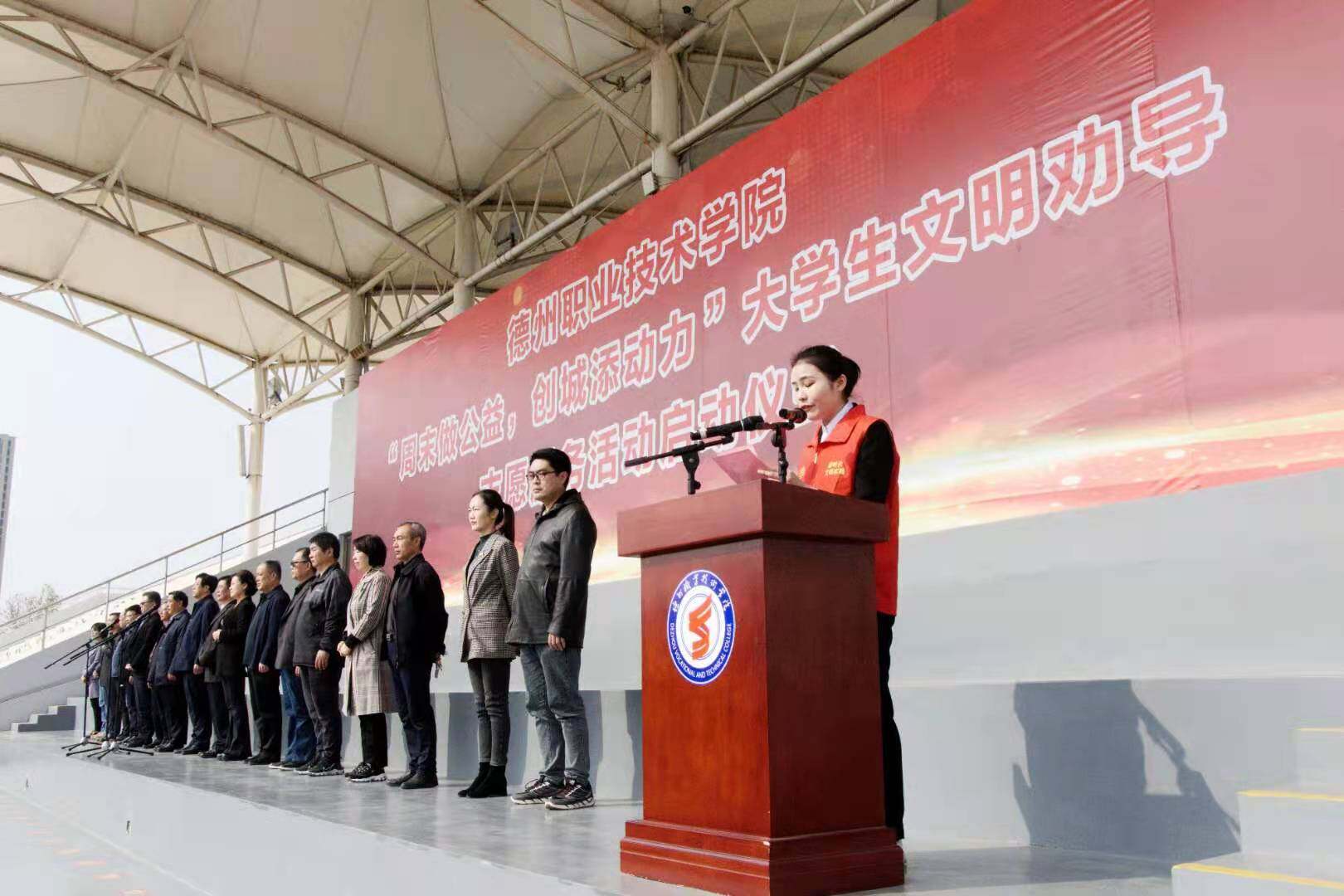 4月10日,“周末做公益,创城添动力”大学生文明劝导志愿服务活动启动仪式在德州职业技术学院举行,旨在深入落实全市创建全国文明城市誓师大会精神,动员大学生志愿者振奋精神、真抓实干,为德州市创建全国文明城市贡献一份力量。