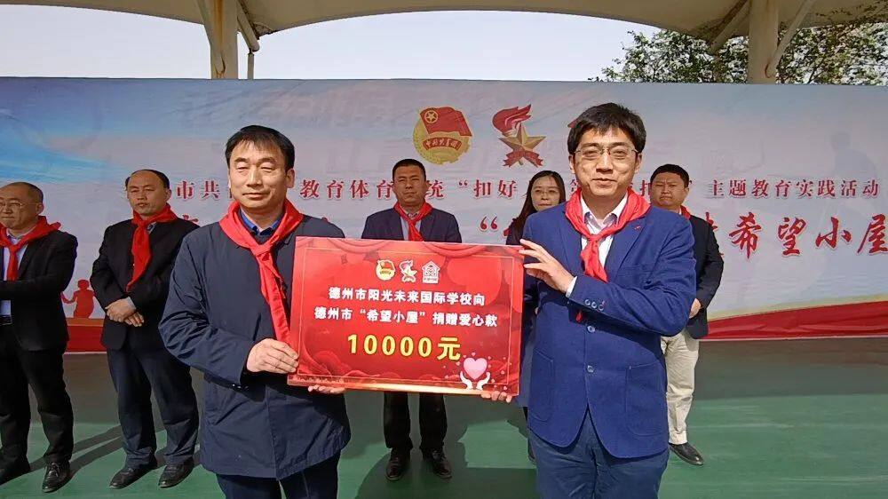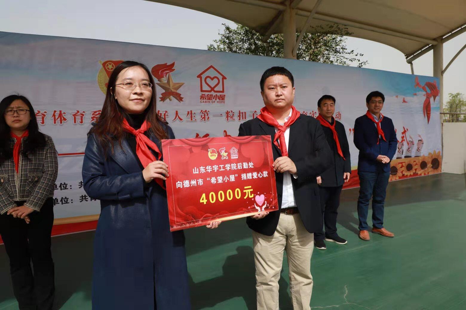 德州晚报全媒体讯 4月16日,德州团市委、市教育体育局、市少工委联合在平原县任继愈小学开展“扣好人生第一粒扣子”主题教育实践活动“牵手同行 点亮希望——红领巾共建希望小屋”启动仪式。活动现场,少先队员宣读了《红领巾共建希望小屋倡议书》,山东省华宇工学院后勤处和德州市阳光国际未来学校分别向德州团市委“希望小屋”项目捐赠了4万元和1万元爱心款。