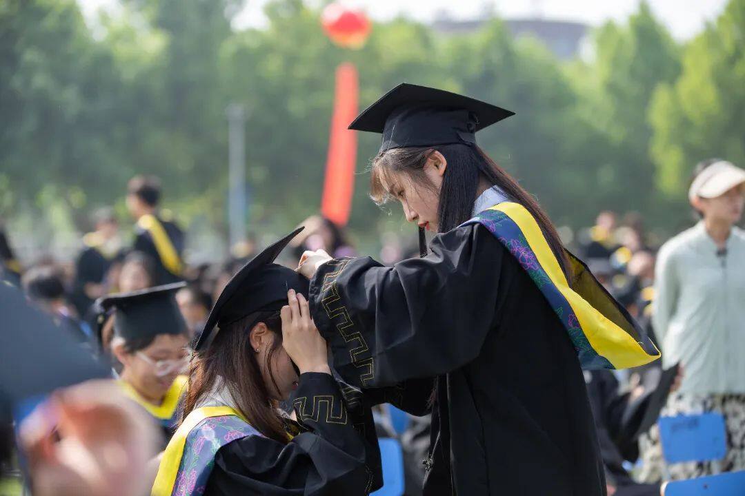副校长王春光宣读《关于授予张彬等同学学士学位的决定》。学位评定委员会委员为2023届本科毕业生拨正流苏、颁发学位证书并合影留念。