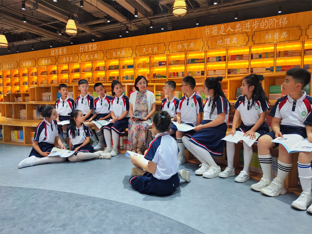教学楼内,大厅为一个开放的图书馆,正中央是仿古竹简《师说》,房顶的横梁上是经典的读书名言,东西两面墙壁上是孔子和学子读书的浮雕,墙壁瓷砖上方粘贴的是经典的绘本,南大厅是开放阅览区。教学楼的每层都有相应的国学经典主题文化,每个班级门外设立班级图书架,走廊上悬挂着描写春夏秋冬等不同景色的诗句。