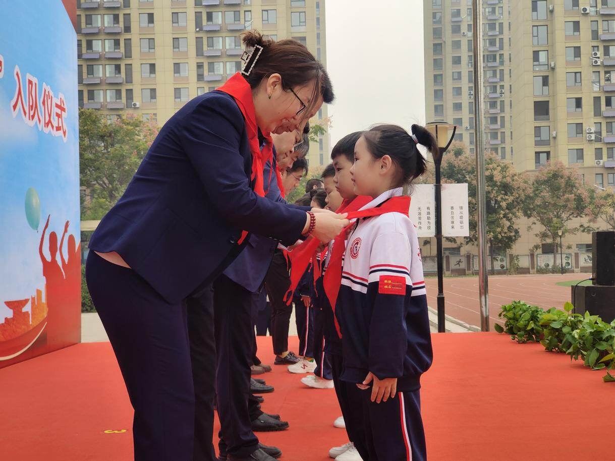 光荣的时刻终于来临,在欢快的音乐声中,各受邀嘉宾与少先队老队员一起为新队员系上红领巾。一条条红领巾既是荣誉的传承,也是责任的传承。学生代表牟瑞雪带领新队员宣誓,老队员重温入队誓词。