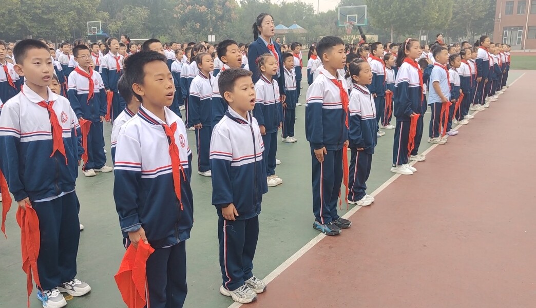 少先队大队辅导员张丛带领队员呼号,嘹亮的呼号声久久回荡。在光荣的队旗下,新少先队员们迈开了人生成长的第一步。