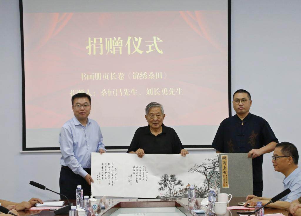 桑恒昌先生从“德州是我的生命家园”和“德州学院是我的精神家园”两方面分享了诗歌创作体会和人生感悟,对文学馆的建设、育人功能及文化引领给予了高度评价。同与会人员代表向学校捐赠了书画长卷《锦绣桑田》(桑恒昌书 刘长勇画)、个人书法作品、著作及藏品等。