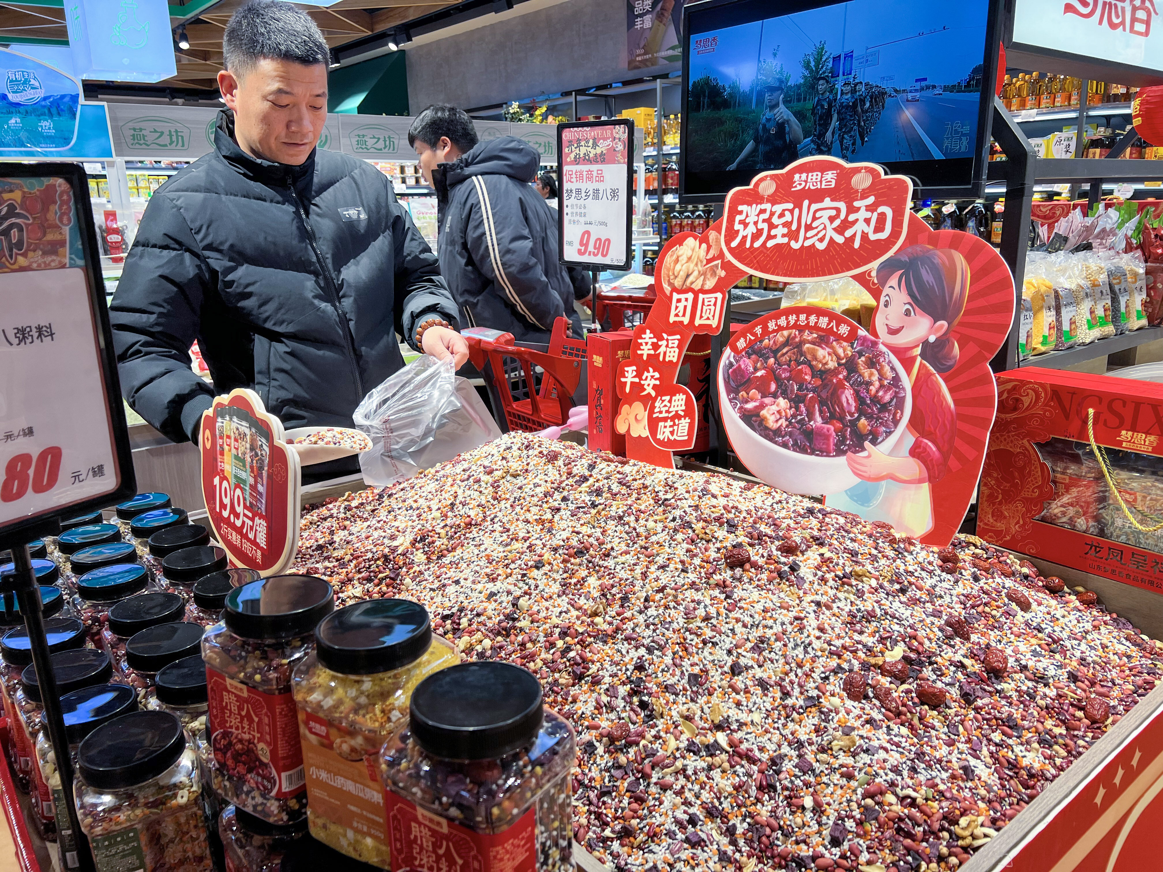 “腊八食材上架十多天了,销量不错。相比去年,今年腊八食材种类增多、价格便宜。”超市工作人员介绍,老年人偏爱传统口味的腊八粥,而年轻人偏爱“个性化”口味的腊八粥。近期,每天售卖30余公斤腊八食材,预计本周末销量翻倍。