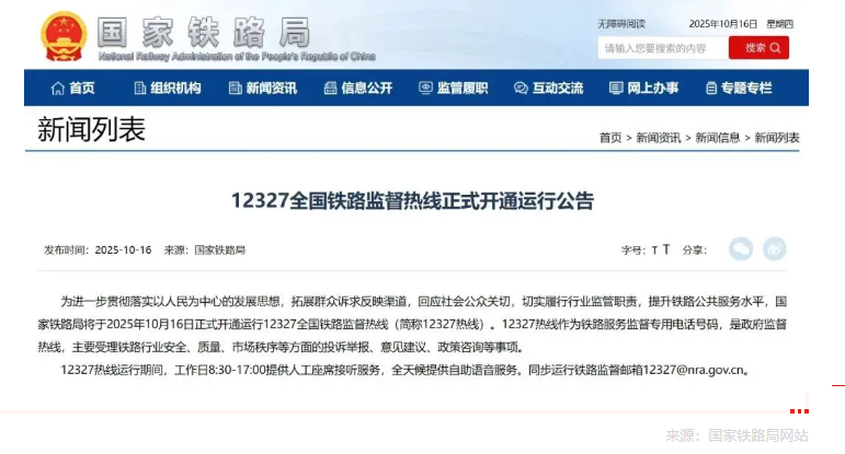 10月16日,国家铁路局正式开通运行12327全国铁路监督热线(简称12327热线),此举旨在进一步贯彻落实以人民为中心的发展思想,拓展群众诉求反映渠道,回应社会公众关切,切实履行行业监管职责,提升铁路公共服务水平。